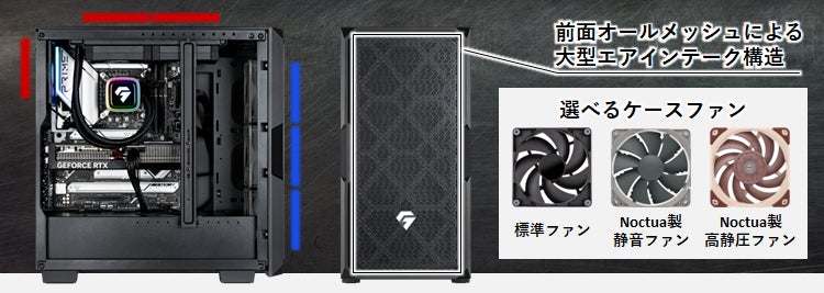 前面をオールメッシュにすることで、横155x縦395mmの大開口を誇る大型エアインテーク構造を実現。前面から直線的に取り込んだ大量のフレッシュエアーがPCパーツを効果的に冷却し、外部へ廃熱します。通常構成では前面に標準ファンを1基搭載。さらにオプションとして、高い信頼性を誇る「Noctua製ケースファン」をご用意。静かさを追求した静音ファンと、冷却性重視の高静圧ファンからお選びいただけます。