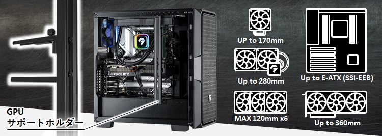 高さと奥行きを抑えたミドルタワーサイズながら、レイアウトの最適化により大型のマザーボードやグラフィックスカード、冷却性に優れた大型の空冷/水冷CPUクーラーを搭載可能。さらに重量級のグラフィックスカードを3方向からガッチリ支えるGPUサポートホルダーをハイエンドGPU構成モデルに標準搭載。マザーボードへの負担を抑え、故障の低減と長期の安定稼働に貢献します。