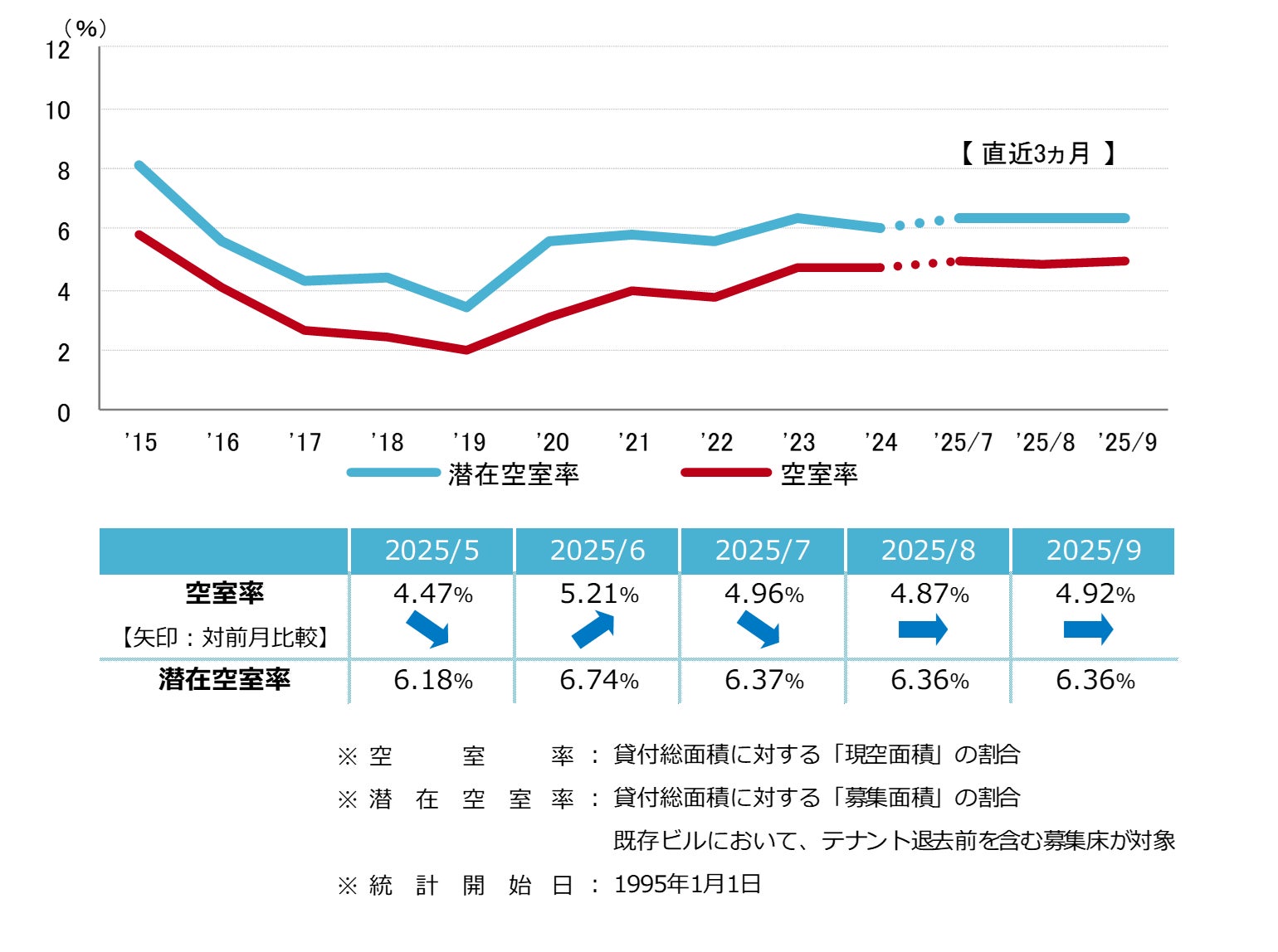 空室率は前月比プラス0.05ポイントの4.92%と、前月から小幅な上昇となった。新築ビルの竣工や自社ビルへの移転により空室が生じている。潜在空室率は前月から横ばいの6.36%だった。