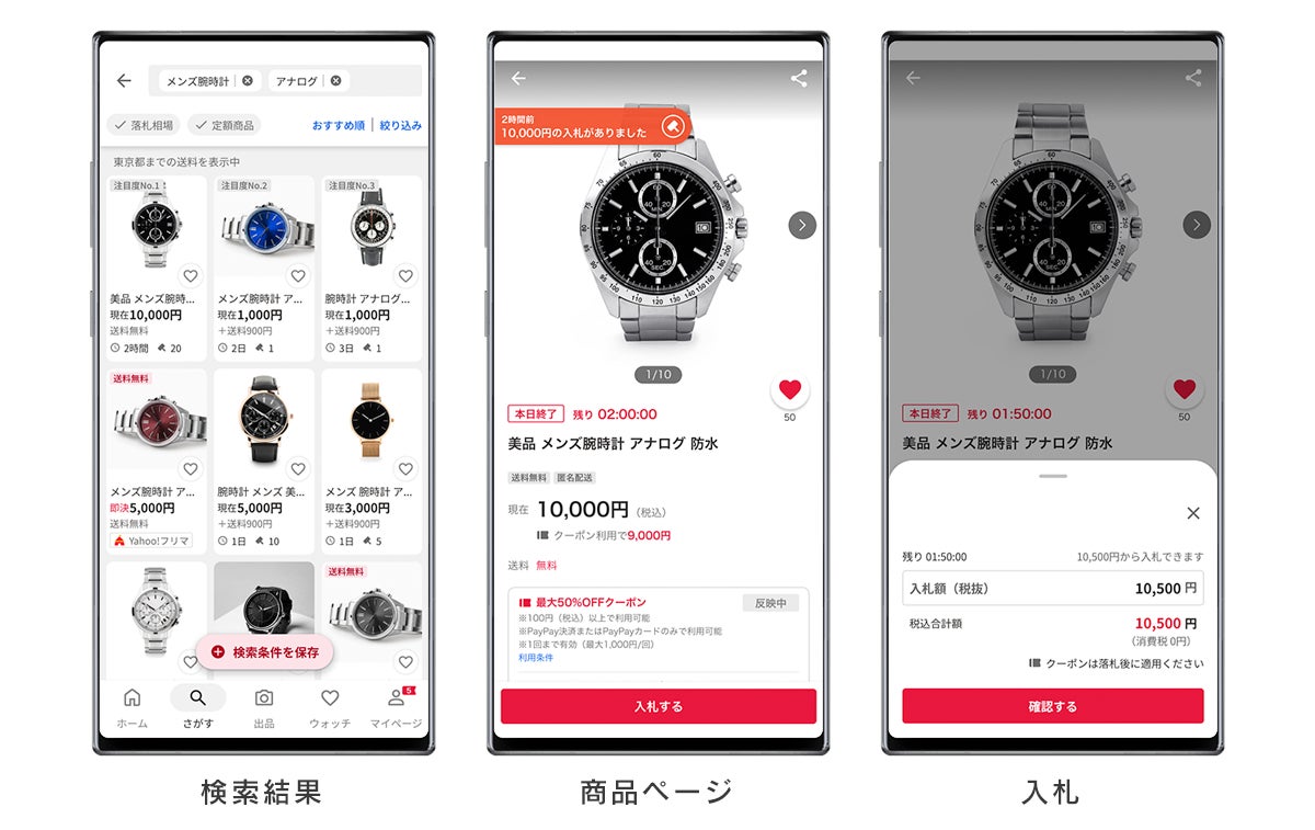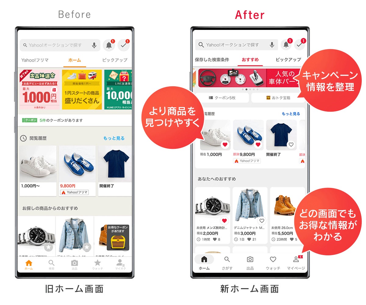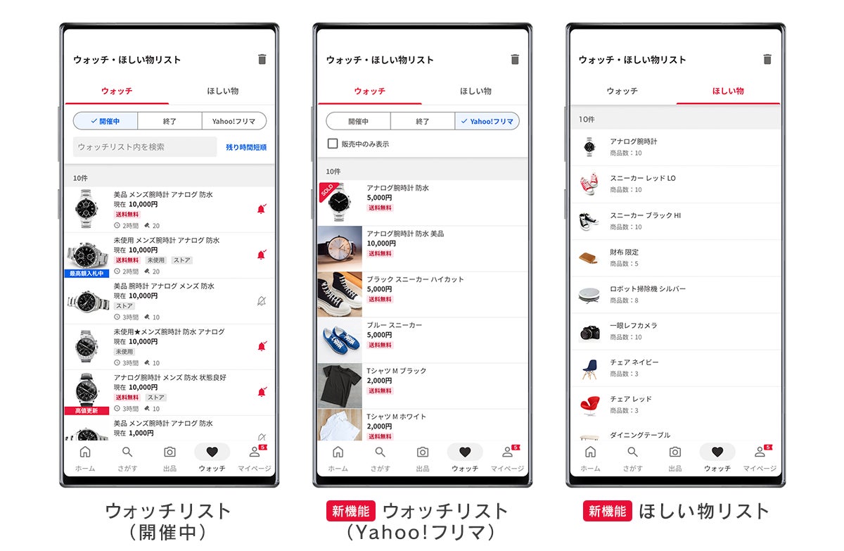 「Yahoo!オークション」「Yahoo!フリマ」両サービスの商品をより探しやすく、迷わずに入札できるデザインへ刷新。一目で商品スペック情報、出品状況を確認できる「ほしい物リスト」などの機能も追加