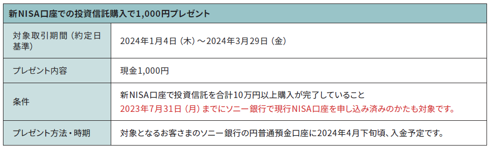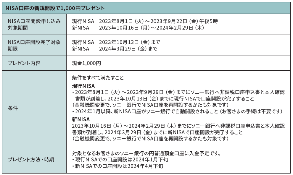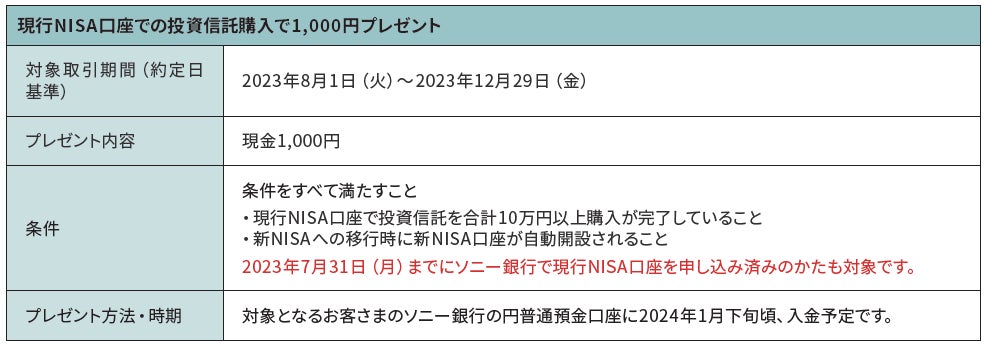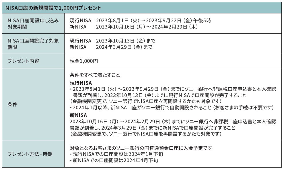 ソニー銀行株式会社(代表取締役社長:南 啓二/本社:東京都千代田区/以下 ソニー銀行)は、2023年8月1日(火)より、NISAのキャンペーンを実施しますので、お知らせいたします。