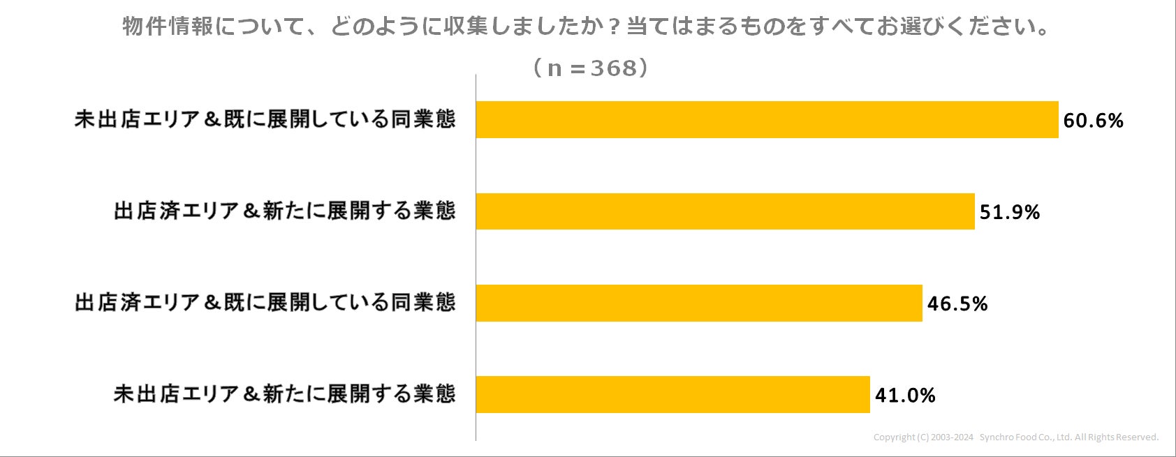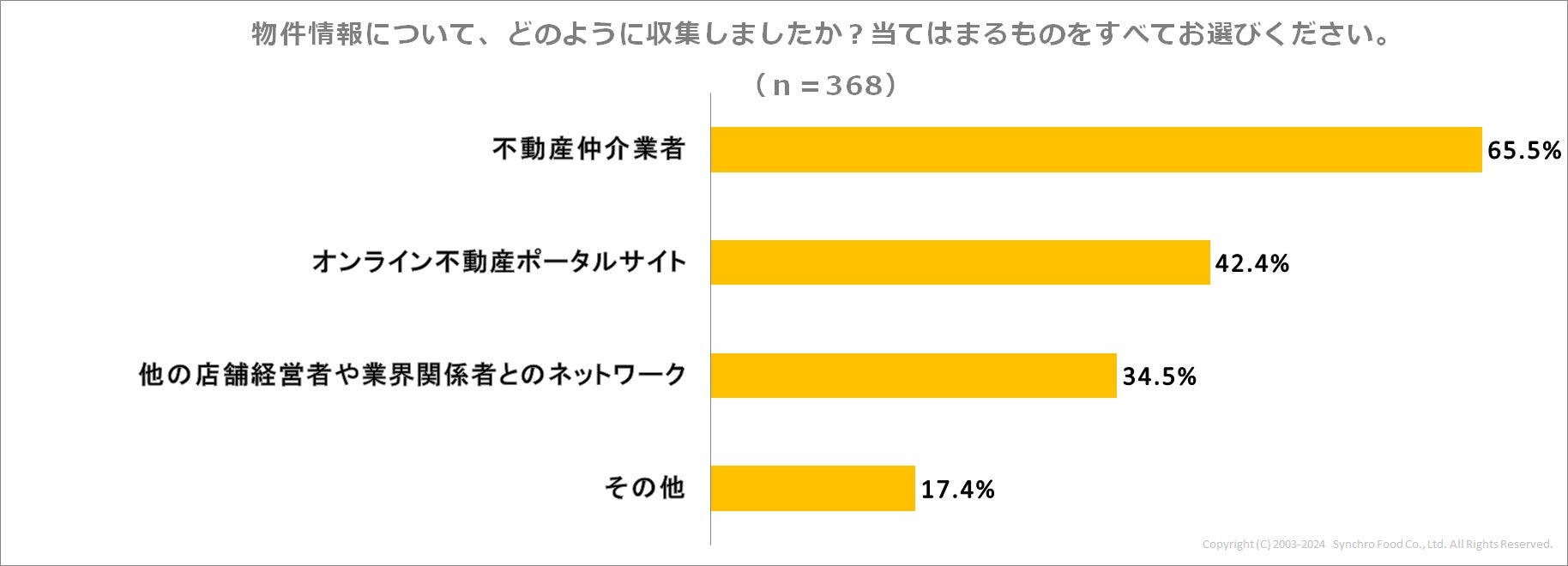 また、物件情報の収集方法について尋ねた質問では、「不動産仲介業者」との回答が65.5%で最多。次いで、「オンライン不動産ポータルサイト(飲食店ドットコム・テンポスマートなど)(42.4%)」、「他の店舗経営者や業界関係者とのネットワーク(34.5%)」との回答が続き、複数の収集方法を活用している店舗も見られました。