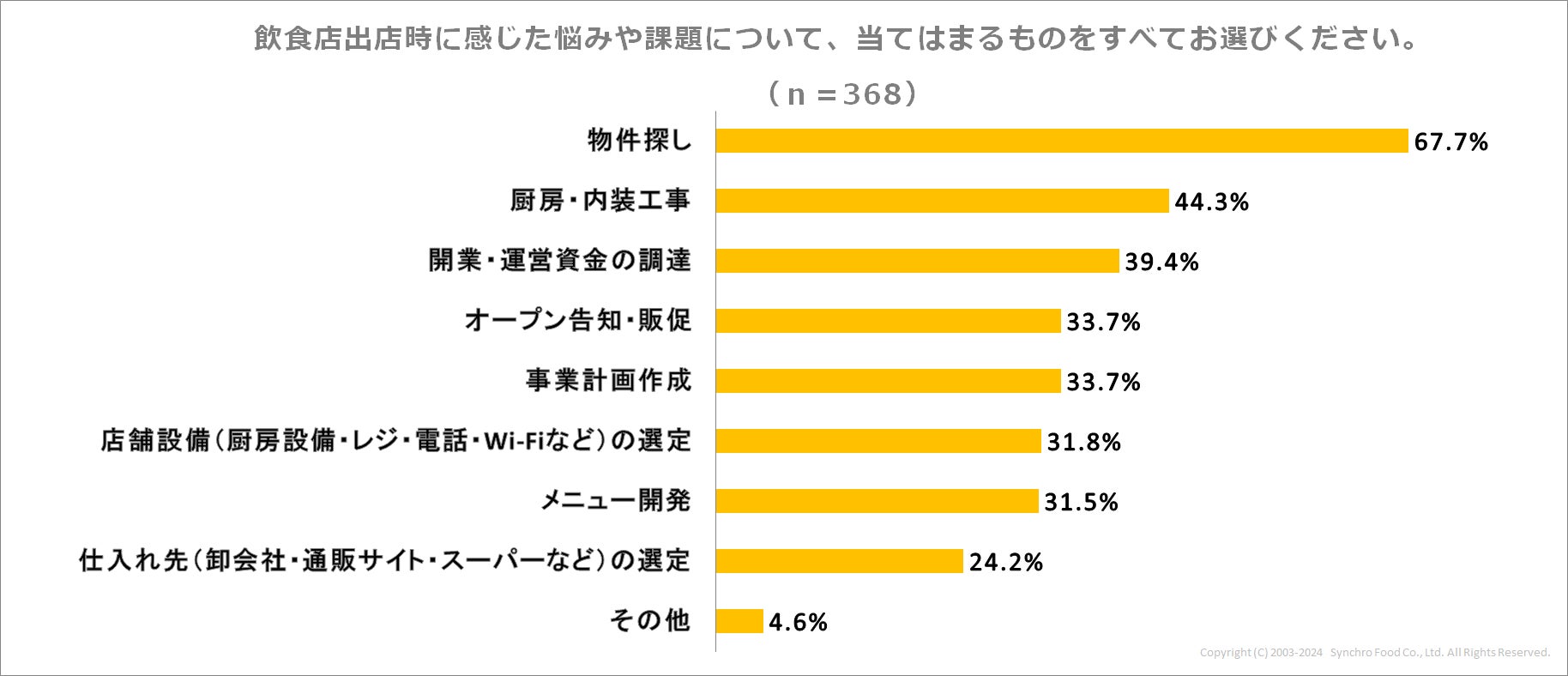 次に、飲食店出店時に感じた悩みや課題について、当てはまるものをすべて選んでもらったところ、最も多かったのが「物件探し」との回答で、67.7%。次いで、「厨房・内装工事(44.3%)」、「開業・運営資金の調達(39.4%)」との回答が続きました。