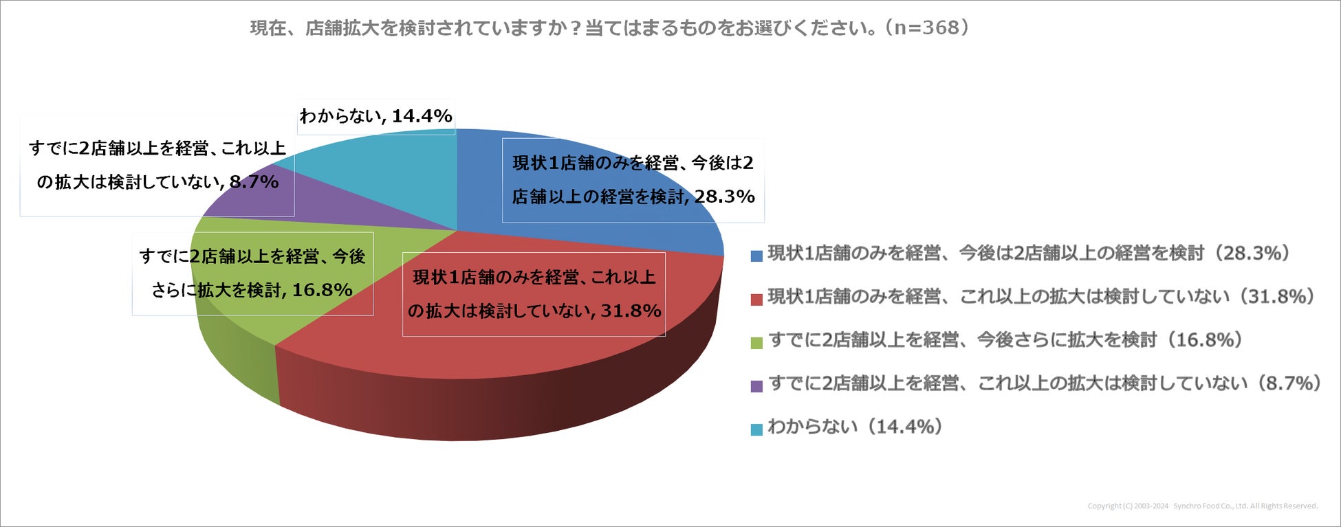 次に、現在、店舗拡大を検討しているか尋ねたところ、最も多かったのは、「現状1店舗のみを経営しており、これ以上の拡大は検討していない(31.8%)」との回答でした。ただし、全体では「店舗拡大を検討している」が45.1%、「これ以上の拡大は検討していない」が40.5%と、店舗拡大を検討している飲食店の方がやや多い状況です。