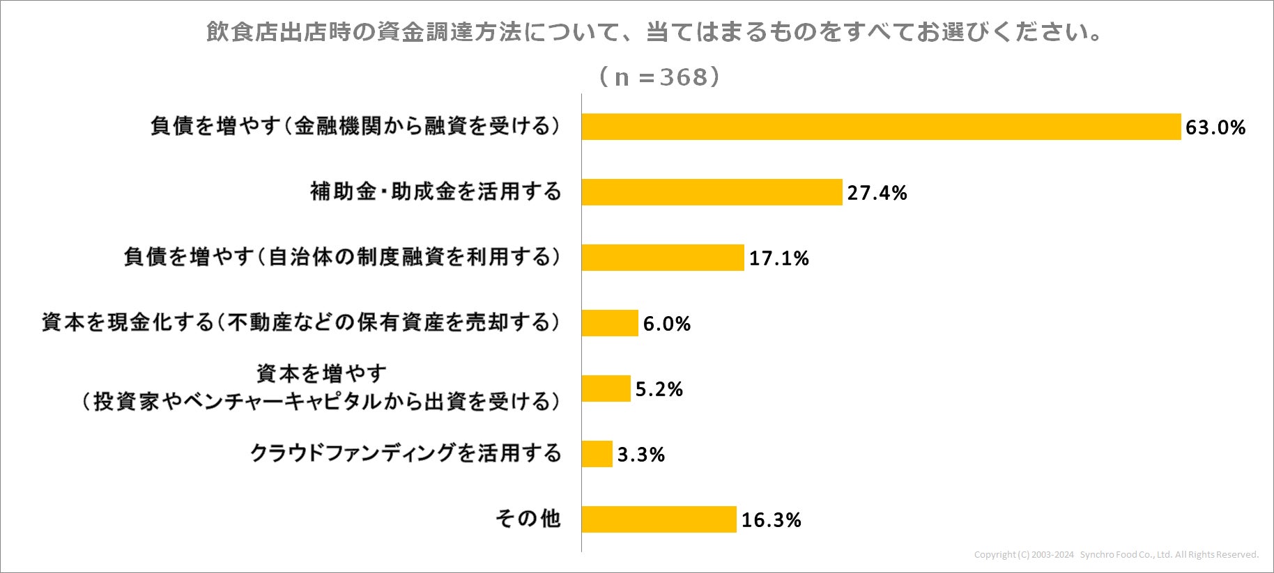 さらに、飲食店出店時の資金調達方法について調査したところ、「負債を増やす(金融機関から融資を受ける)」が63.0%と、金融機関から資金を調達している店舗が多いことが明らかとなりました。このほか、「補助金・助成金を活用する」との回答も27.4%得られました。
