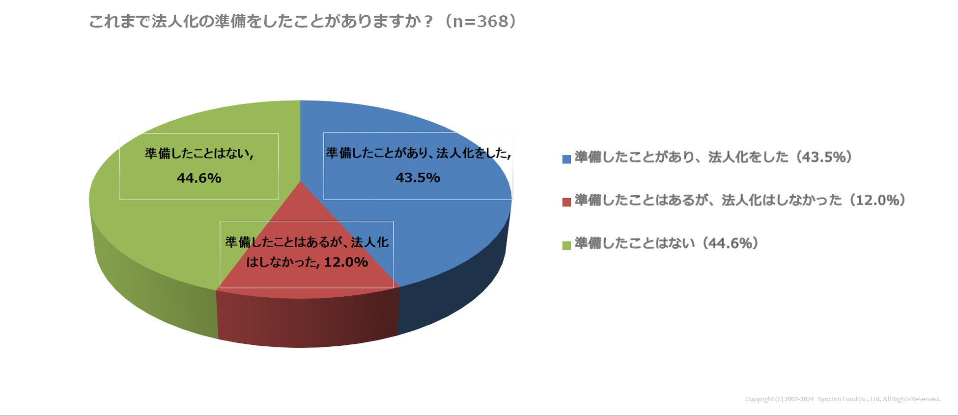 また、これまで法人化の準備をしたことがあるか尋ねたところ、「準備したことはない」が44.6%、「準備したことがあり、法人化をした」が43.5%と、二極化する結果となりました。また、少数ですが、「準備したことはあるが、法人化はしなかった(12.0%)」という回答も得られました。