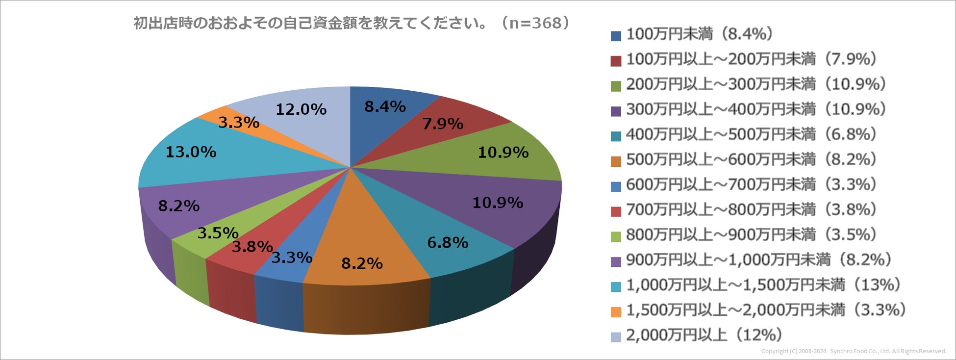 続いて、初出店時の自己資金について尋ねたところ、最多は「1,000万円以上~1,500万円未満(13.0%)」との回答ですが、全体を見ると、44.9%が「500万円未満」と回答。「500万円以上~1,000万円未満」は27%、「1,000万円以上」は28.3%となっており、自己資金500万円未満で初出店する店舗が多いようです。