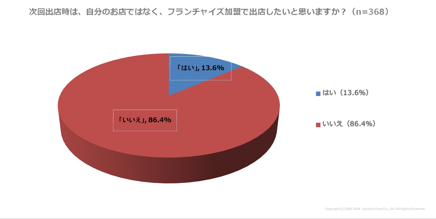 続いて、次回出店時にフランチャイズ加盟で出店したいと思うか尋ねたところ、13.6%が「はい」、86.4%が「いいえ」と回答。多くの飲食店がフランチャイズ加盟ではなく、自分のお店を出したいと考えていることが明らかとなりました。