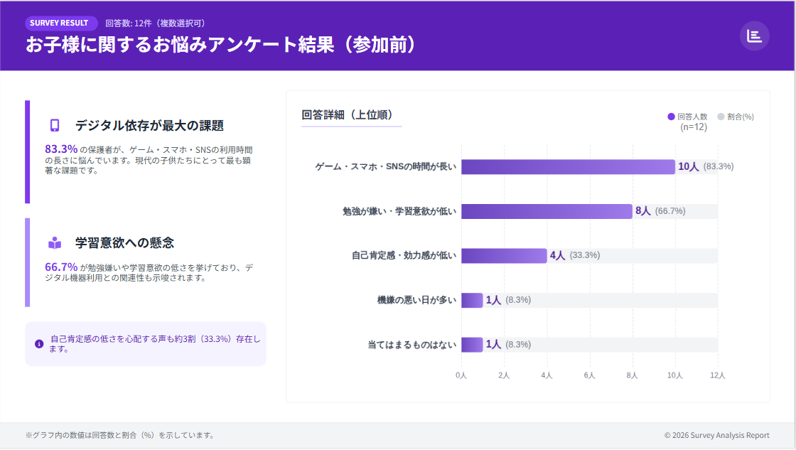 自治体向け提供に先立ち、兵庫県川西市において試験的に簡易版プログラムを実施しました。川西市での試行導入にあたっては、参加前に保護者を対象としたアンケートを実施しました。その結果、ゲーム・スマートフォン・SNSの利用時間の長さに悩んでいると回答した保護者が83.3%、学習意欲の低下を懸念する声が66.7%にのぼり、家庭内での関わり方に悩みを抱える保護者が多い実態が明らかになりました。自己肯定感の低さを心配する回答も3割を超えており、子どもの行動や学習に対する不安が、日常的な声かけや関わり方の難しさと結びついている状況がうかがえます。