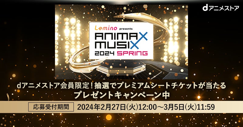 3月30日(土)開催「Lemino presents ANIMAX MUSIX 2024 SPRING」のプレミアムシートチケットをdアニメストア会員限定で抽選プレゼント!是非エントリーください!