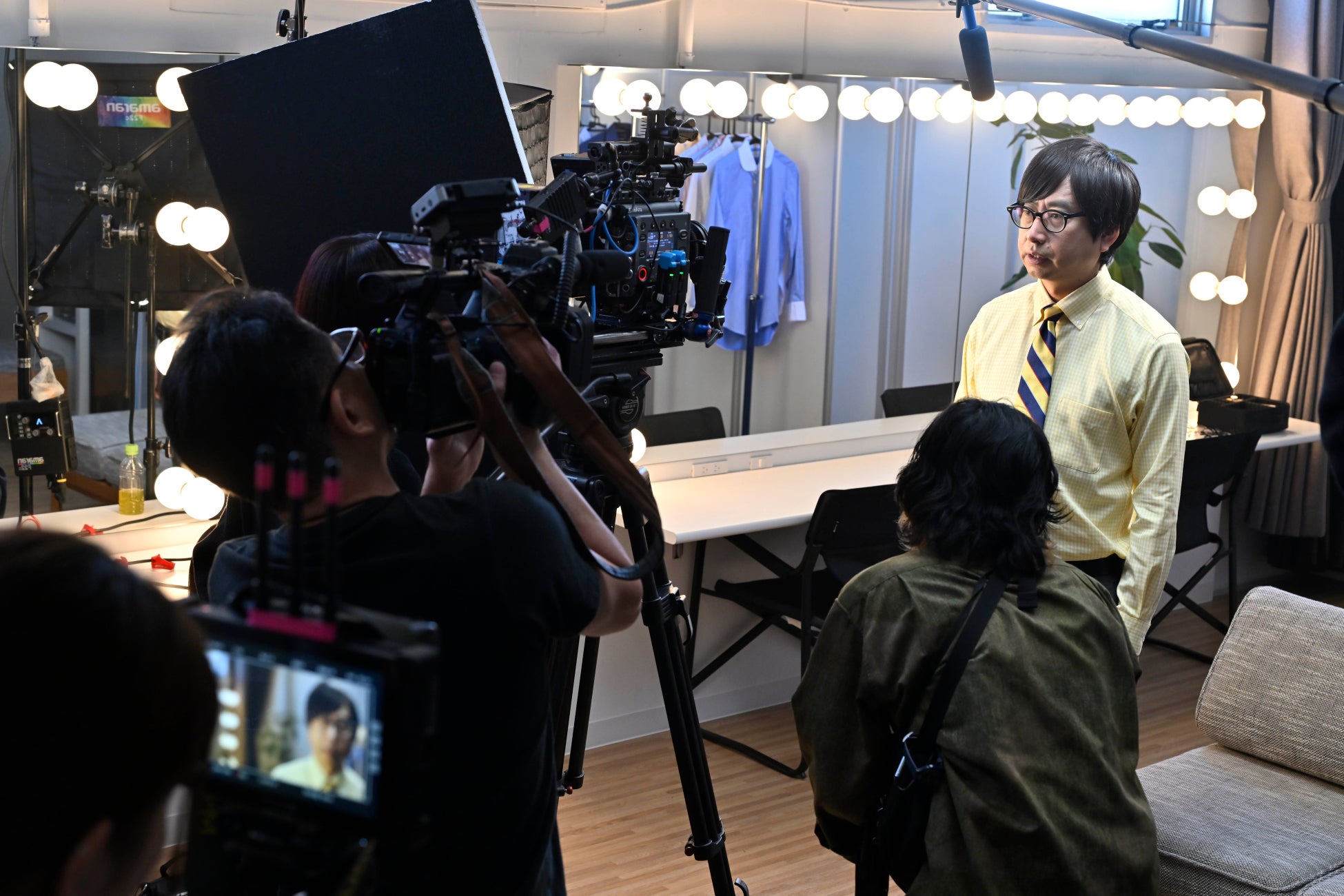 緊張した面持ちでスタジオに入るおいでやす小田さん。撮影中は、終始マネージャー役から「キレやすく、嫌いな芸人の顔トップ10に」「声がでかいだけで中身がない」と辛辣な言葉を浴びせられます。周りのスタッフから思わず「可哀そう」とのコメントまで。どんどん悲しそうな表情になっていくおいでやす小田さんですが、カットの合図が入ると安心したかのように、顔がほころびほほ笑む姿が印象的でした。撮影スタッフからのアドバイスを真摯に受け止め、さまざまな要望に応えていくおいでやす小田さんの演技力の高さにも注目が集まりました。スタジオにおいでやす小田さんの大声が響き渡った後には、あまりの熱演ぶりに笑いが起こる場面も。終始和やかな雰囲気で撮影は進みました。