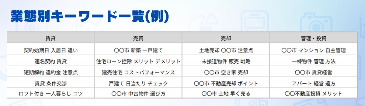 「AIコンテンツ生成」は、4,000サイト以上の不動産ホームページ制作実績と、累計10万記事以上のブログ執筆実績で培ったノウハウを活かし、SEOに強い不動産専門のブログ記事を生成AIで自動作成できる機能です。