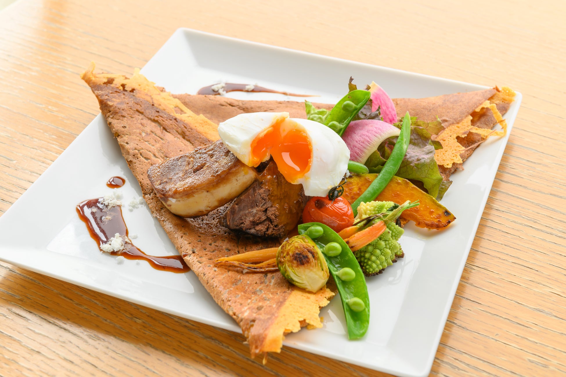 「長崎産 旬の彩り野菜と牛ホホ肉・フォアグラのロッシーニ風ガレット」