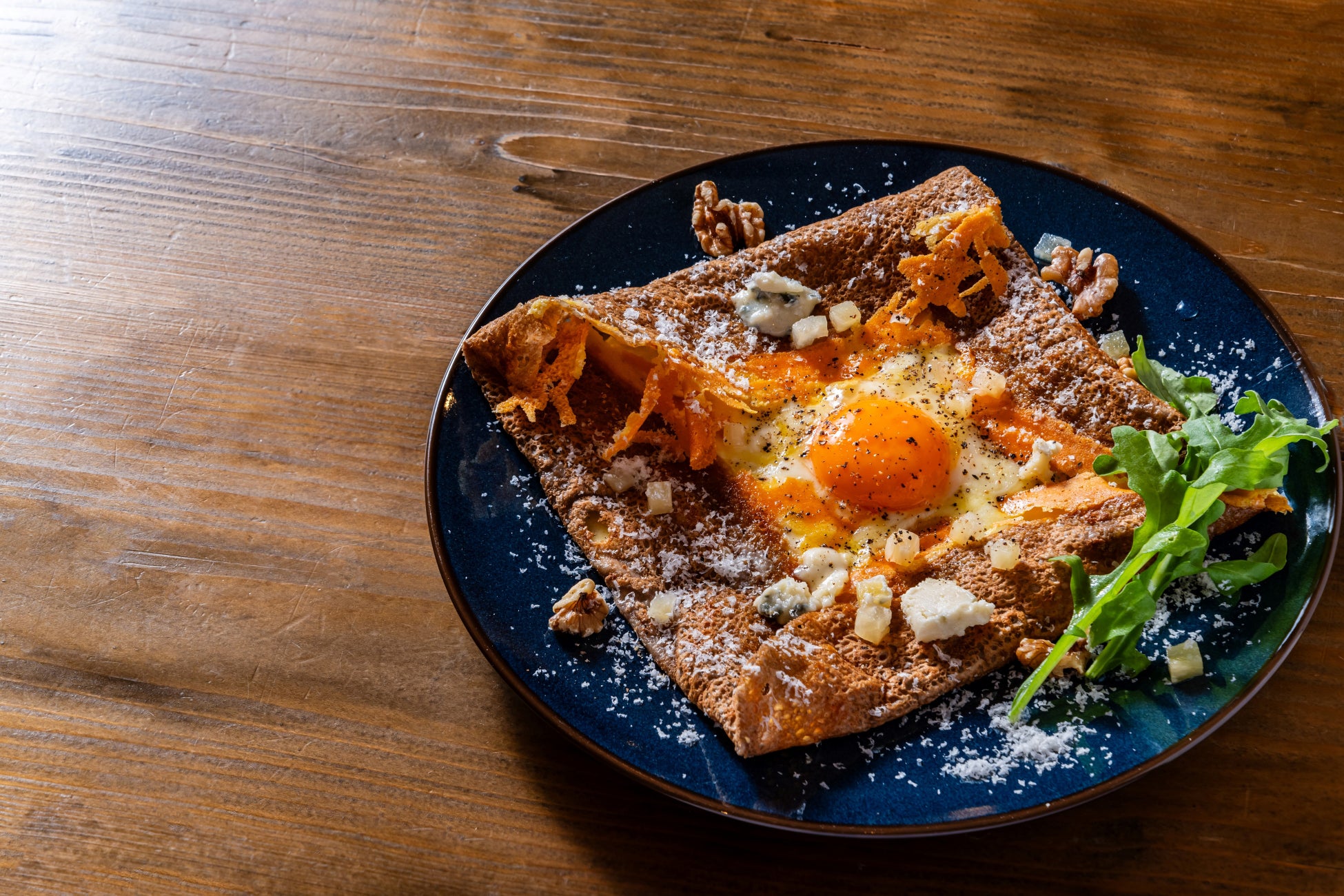 そば粉の風味は残しつつ卵や薄力粉を混ぜることで、外はパリッと中はしっとりと焼き上がる生地に仕上げています。焼き上げの際、生地のふちにミルクの風味が豊かで優しい味わいのチーズ“グラナパダーノ”を振りかけ、チュイル状にすることでパリッサクッとした食感をお楽しみいただけます。