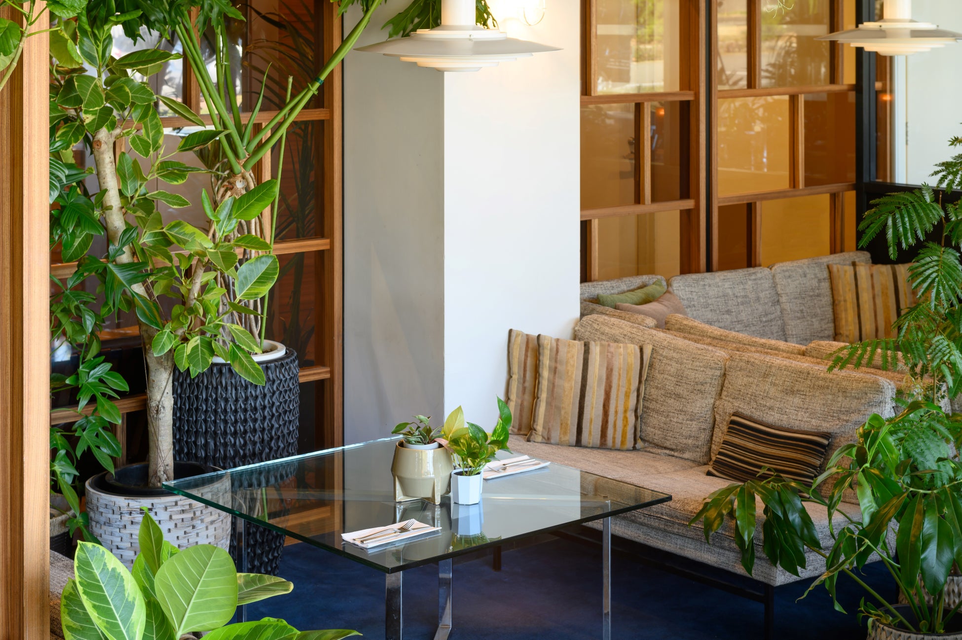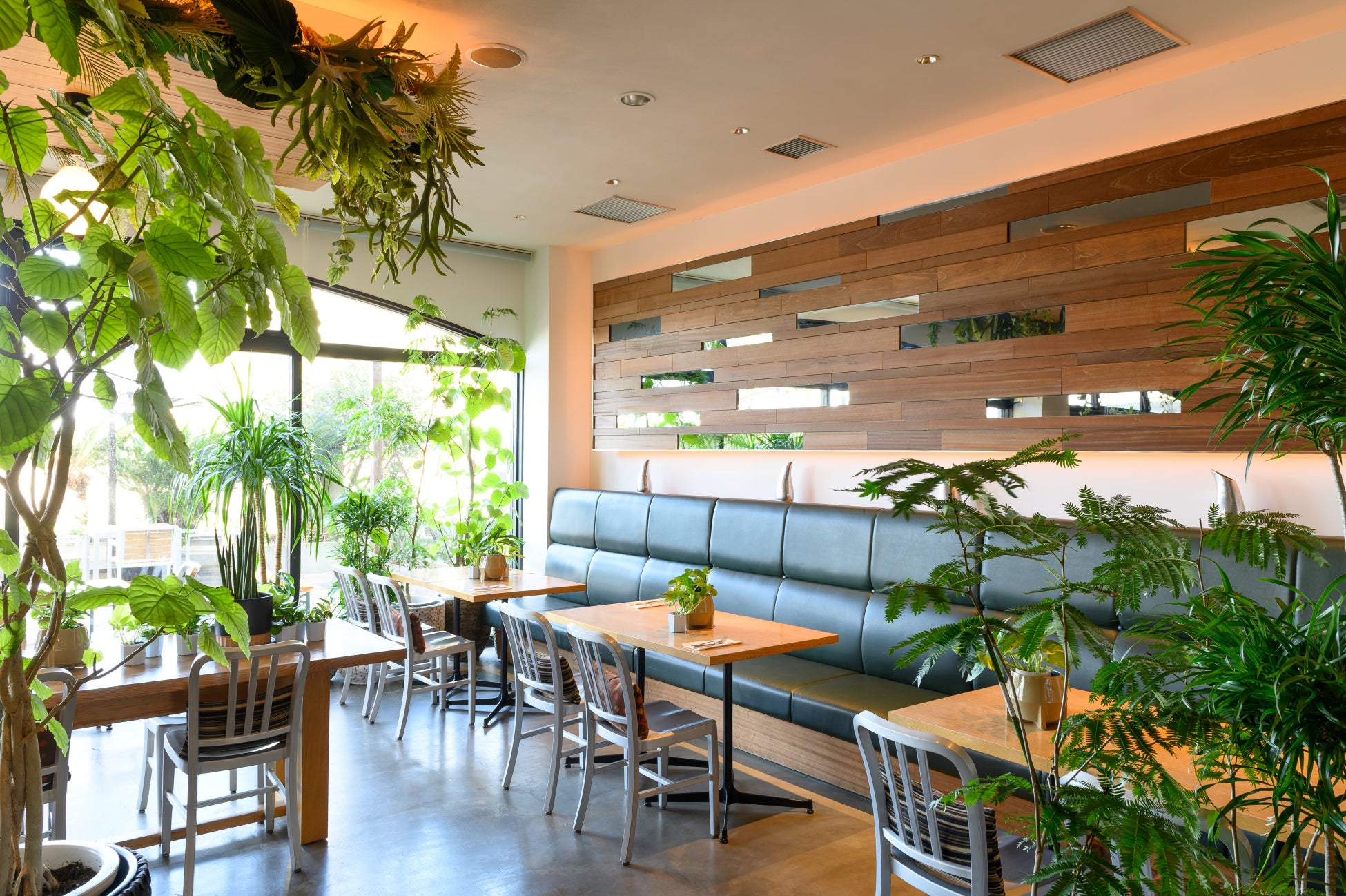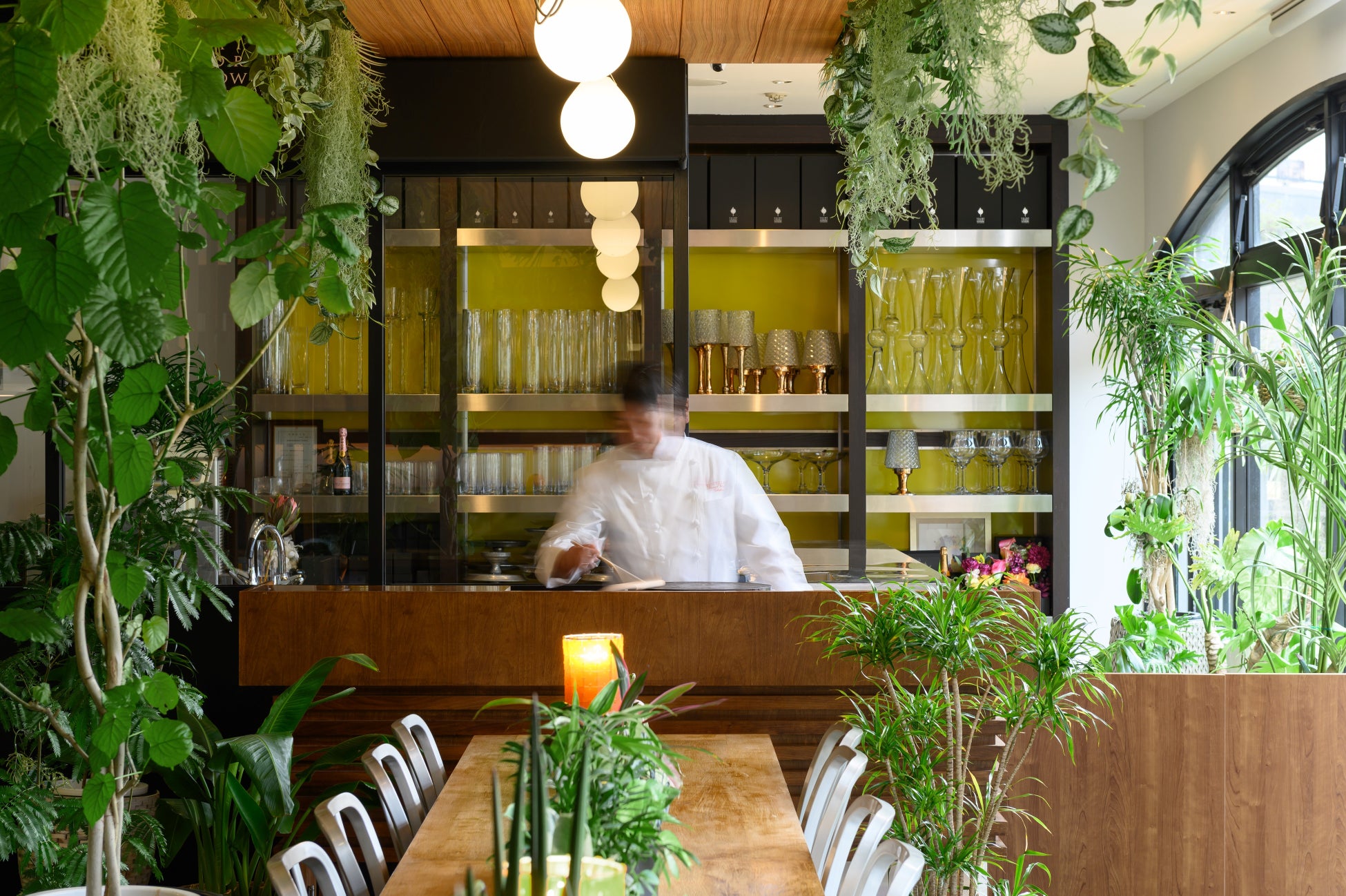 店内は同フロアで営業しております、フラワーブランド「SAINT JORDI FLOWERS THE DECORATOR(サンジョルディフラワーズ ザ・デコレーター)」が担当し、グリーンあふれる空間へと生まれ変わりました。植栽装飾は生の植物を使用し、気に入ったものは当日ご購入、お持ち帰りいただけます。