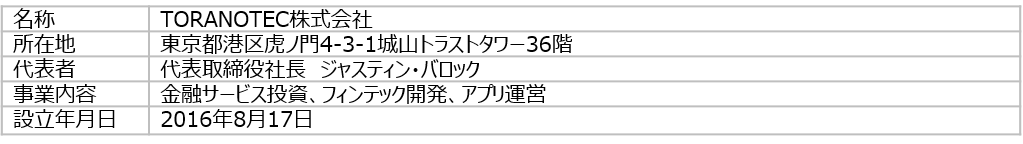 TORANOTEC株式会社は、「すべての人を投資家に」というビジョンのもと、投資を始める上でのハードルを極限まで下げて、資産運用の知識・経験がほとんどない若年層を含め幅広い方々に、スマホで気軽に楽しく「おつり」や各種ポイント・マイルで資産形成を行うサービスを開発するフィンテック企業です。完全子会社のTORANOTEC投信投資顧問株式会社から提供する資産運用サービスを人々の日々の消費生活と結びつけることで、投資を生活の当たり前の一部にし、誰もが将来のために長期的な資産運用ができる世界の実現を推進しています。