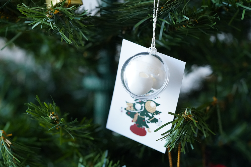 パッケージは、透明のボールにsocksを詰め込みオーナメント仕様にしています。さらに、今回のアニメーション内で描かれているクリスマスツリーイラストのタグ付きです。ホリデー気分を盛り上げる特別なパッケージはギフトにもおすすめです。