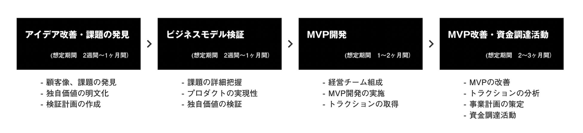採択された起業家は、スタートアップ支援事業者の支援を受けながら資金調達に向けて事業検証に取り組みます。支援範囲は、「アイデア改善・課題の発見」「ビジネスモデル検証」「MVP開発」「MVP改善・資金調達活動」の大きく4つのステップに分かれますが、途中から参画することも可能です。事業フェーズに合わせた支援を行います。