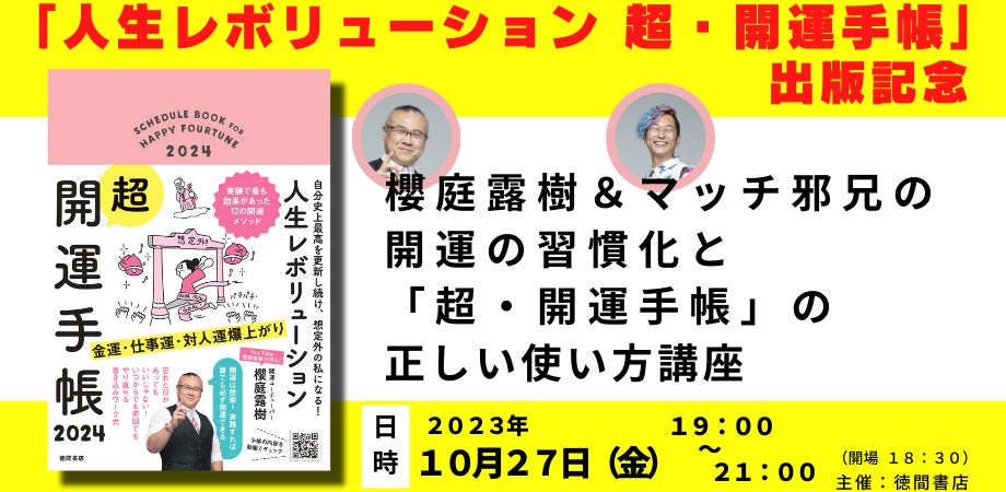 桁外れに運がいい人、成功者、国内外のセレブを間近で見つめて得た開運法を著者自ら実践して、実際に結果が出たモノだけを紹介しています。その手帳の正しい使い方、実践方法、2024年の開運メソッドを本講座で大公開します! 開運⼤王・櫻庭露樹と相⽅であるマッチ邪兄のスペシャルトークイベント。トークのほか、質疑応答やサイン即売会、撮影会などのプログラムも開催予定。参加者にはさまざまな特典をご⽤意しています。