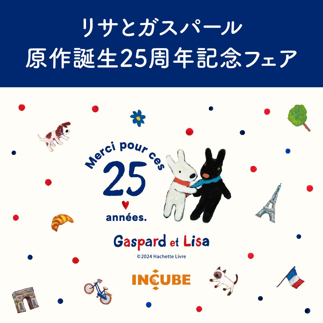 うさぎでもない、いぬでもない、とびきりキュートなパリの住人「リサとガスパール」は、今年で原作誕生25周年。「リサとガスパール」と雑貨館インキューブの25周年を記念して、ぬいぐるみやポーチ、ステーショナリー雑貨など、新作商品を中心に約200種類の商品を期間限定で販売いたします!