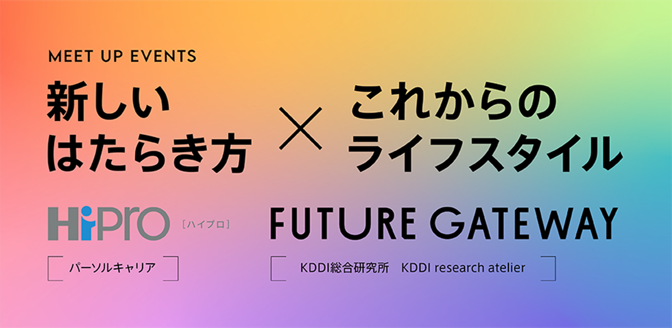 転職サービス「doda」などを提供するパーソルキャリア株式会社のプロフェッショナル人材の総合活用支援サービス「HiPro(ハイプロ)」< https://hipro-job.jp/ >は、株式会社KDDI総合研究所が推進する、先進的な生活者と未来を見据えた新たなライフスタイルを共創する「FUTURE GATEWAY」<https://future-gateway.jp/>と、2023年3月に「新しいはたらき方」×「これからのライフスタイル」をテーマにMEET UP EVENTS (計3回シリーズ)を開催します。