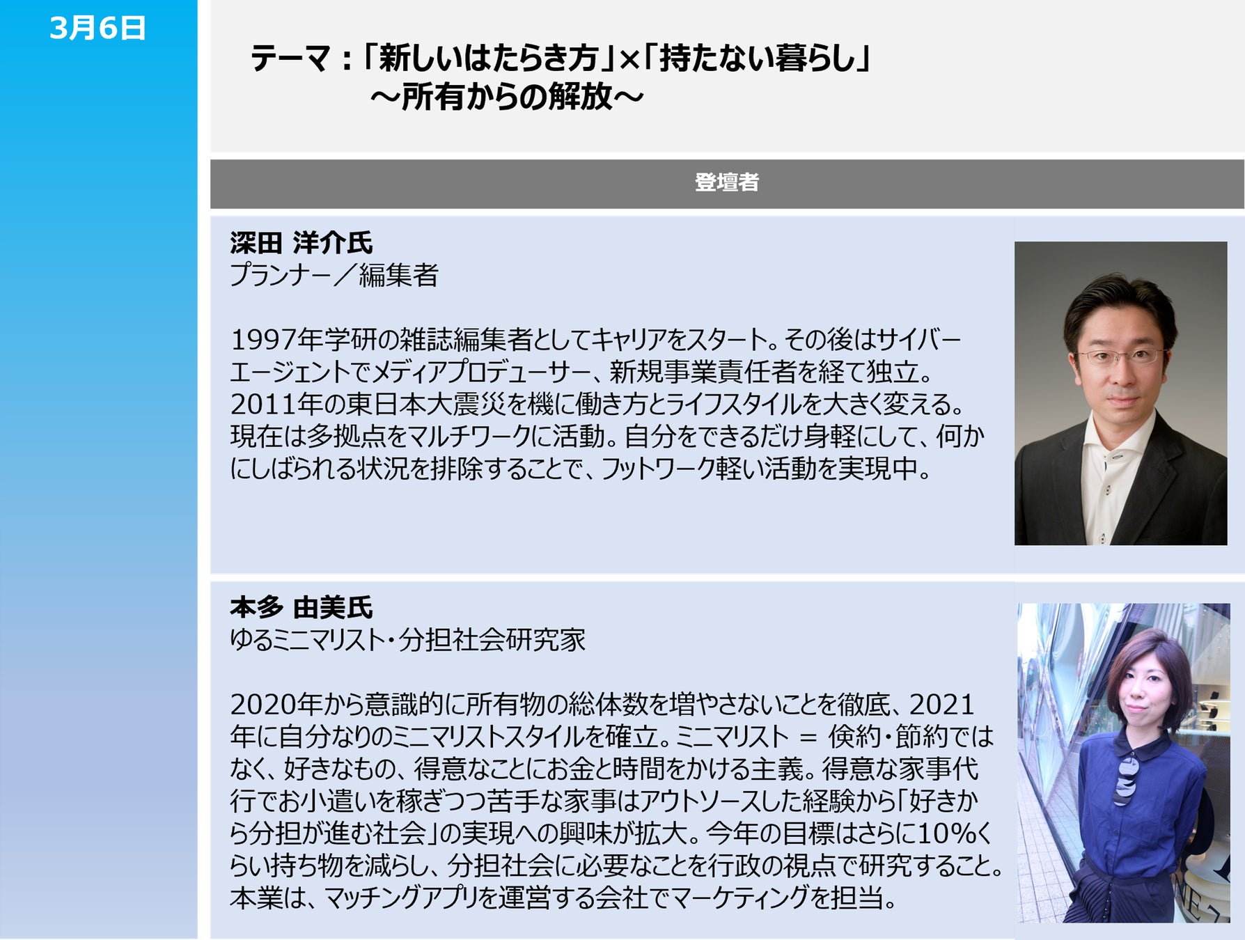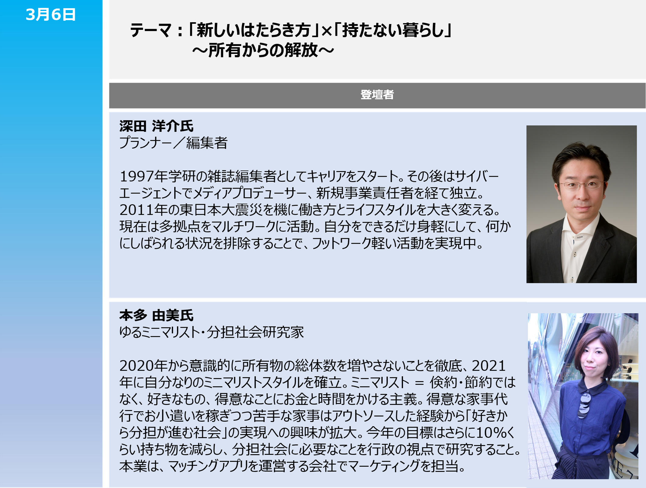 そこで今回、これからのはたらき方・ライフスタイルを考えるきっかけを提供する「MEET UP EVENTS」を開催する運びとなりました。本イベントでは「持たない暮らし〜所有からの解放〜」「ウェルビーイング」「Learning Community」をテーマに、マルチステージな生き方を実践している方をゲストにお招きし、「こだわりのはたらき方」や「こだわりのライフスタイル」についてさまざまな角度からお話しいただくとともにマルチステージ時代のライフスタイルを紐解いていきます。