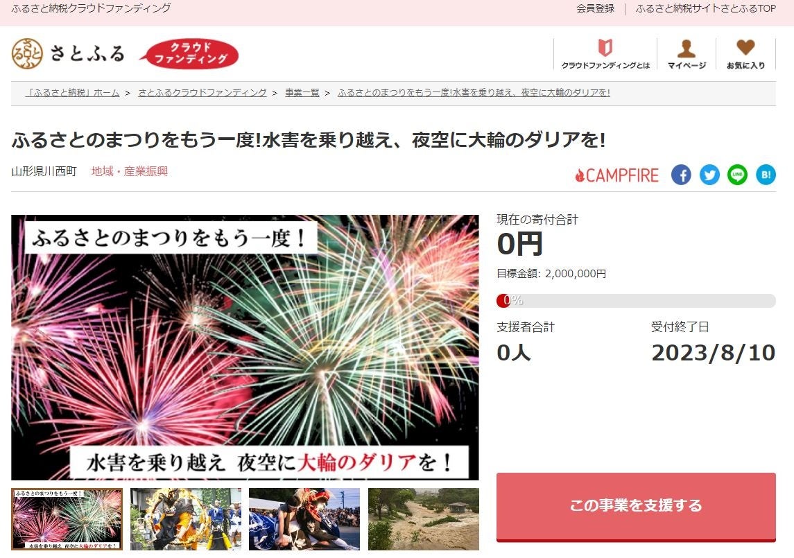 山形県川西町とさとふる、水害とコロナ禍を乗り越え4年ぶりに開催する「かわにし夏まつり」で花火を打ち上げるため、寄付受け付けを開始