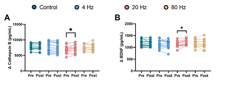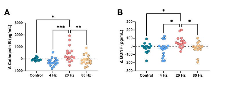 介入前と比較して20Hzでの刺激は介入後のカテプシンBおよびBDNF濃度を有意に増加させた。さらに20Hzでの刺激は4Hz、80Hzでの刺激やコントロール条件よりもカテプシンBおよびBDNF濃度を有意に増加させた。