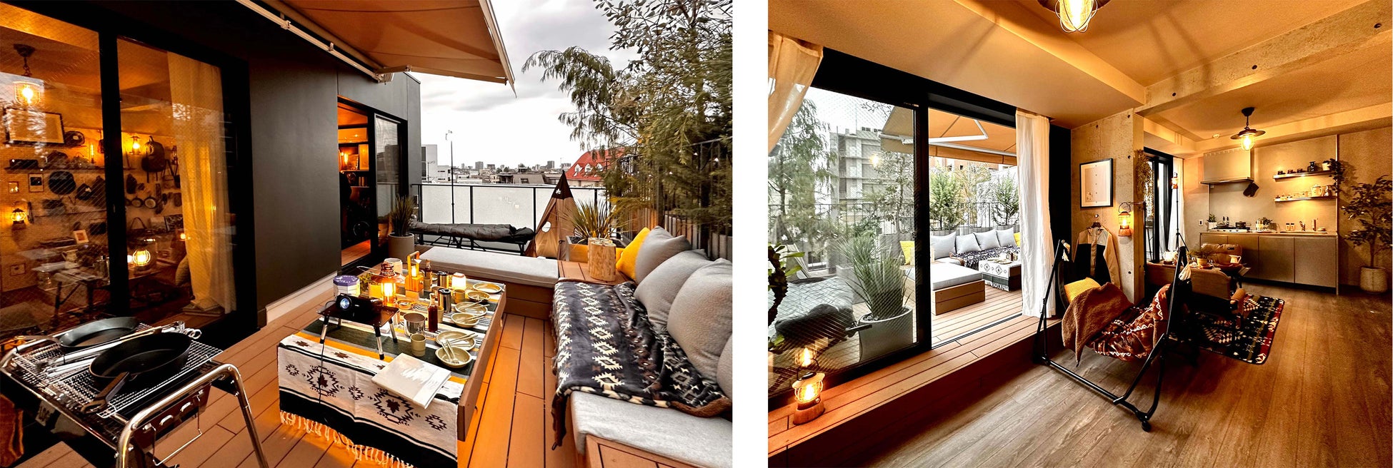 この部屋にある約12帖の大きなルーフバルコニーには、備え付けのテーブルとソファーがあり、アウトドアに最適です。室内とバルコニーの間にある大きな窓で、「アウトドアリビングゾーン」をシームレスにつなぎます。グリルで仲間とBBQを楽しんだり、ソファーやベンチで寛いだり、色んな使い方をお楽しみいただけます。