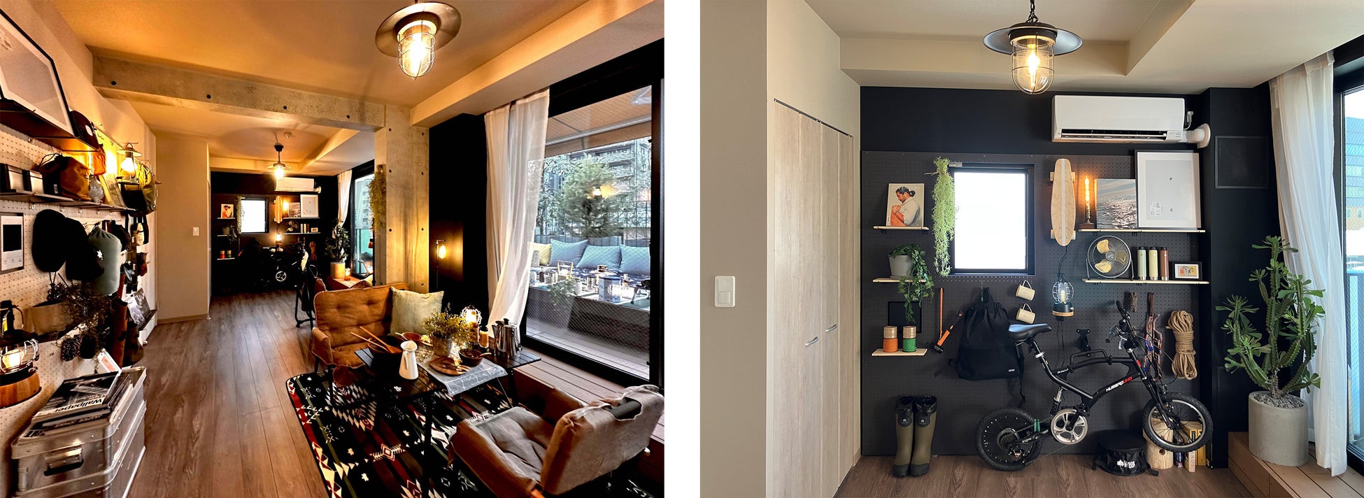室内には有孔ボードを壁に取り付け、アウトドア用品を壁面に収納&飾れる仕掛けが施されています。備え付けのフックと棚板は、自分好みの空間になるよう好きな位置にカスタマイズできます。