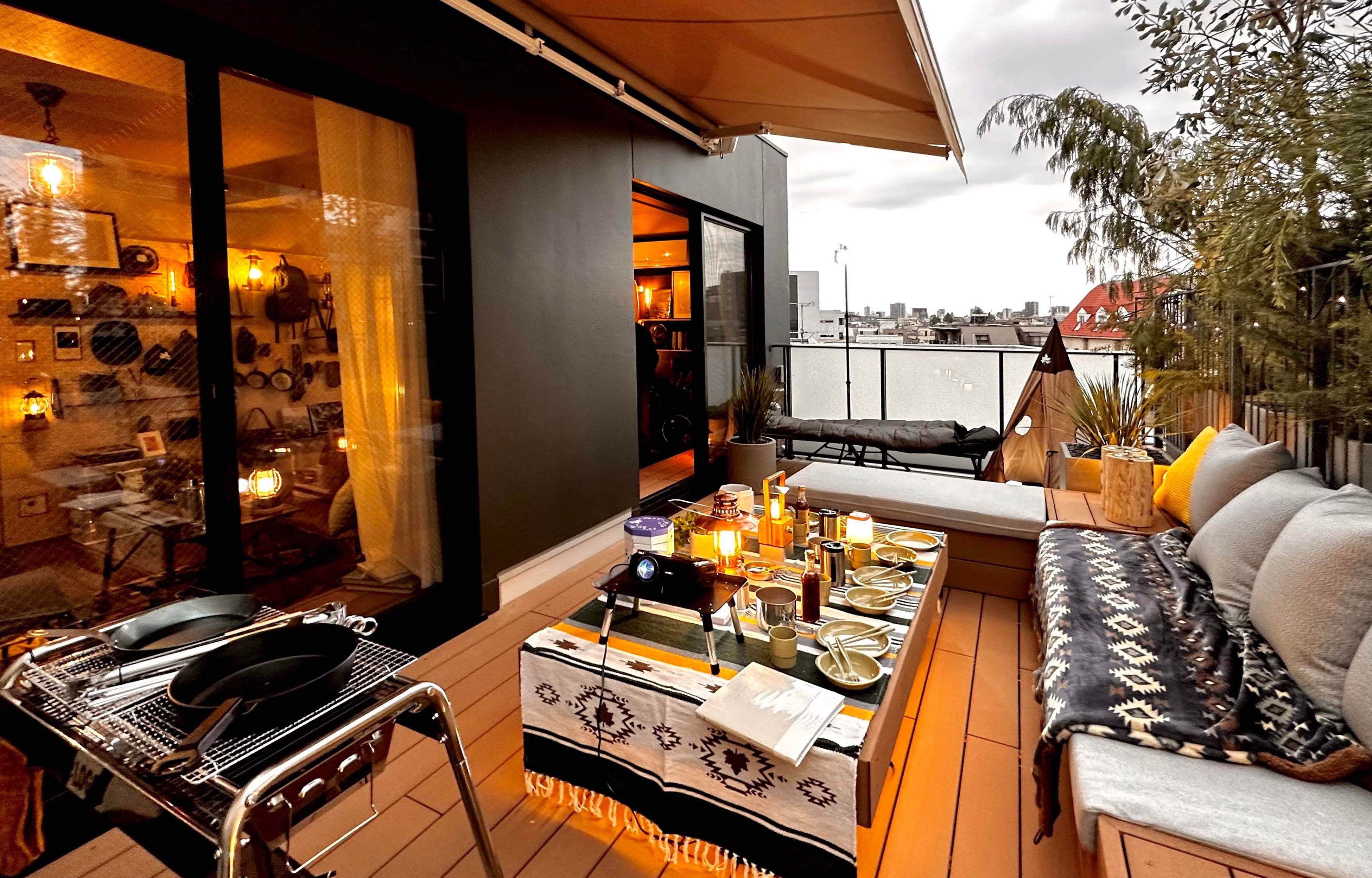 この部屋にある約12帖の大きなルーフバルコニー。バルコニーには備え付けのテーブルとソファーがあり、アウトドアに最適!室内とバルコニーの間にある大きな窓で、「アウトドアリビングゾーン」をシームレスにつなぎます。