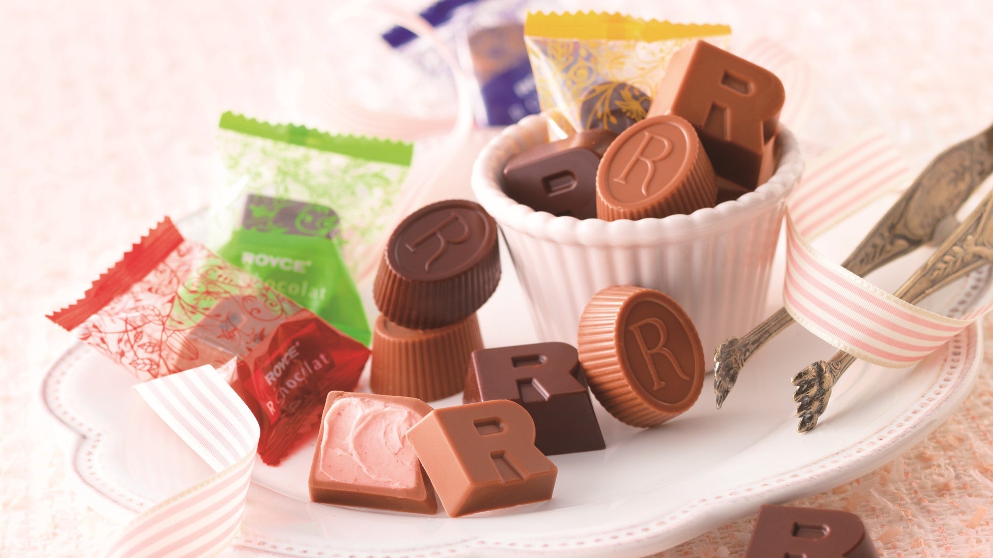 フルーツやナッツのクリームなどが入ったひと口ショコラ。ロイズの頭文字“R”をモチーフにした2つのカタチに、ジャンドゥーヤ、ストロベリー、ミルクココア、レモンの4種類の味わいを閉じ込めました。