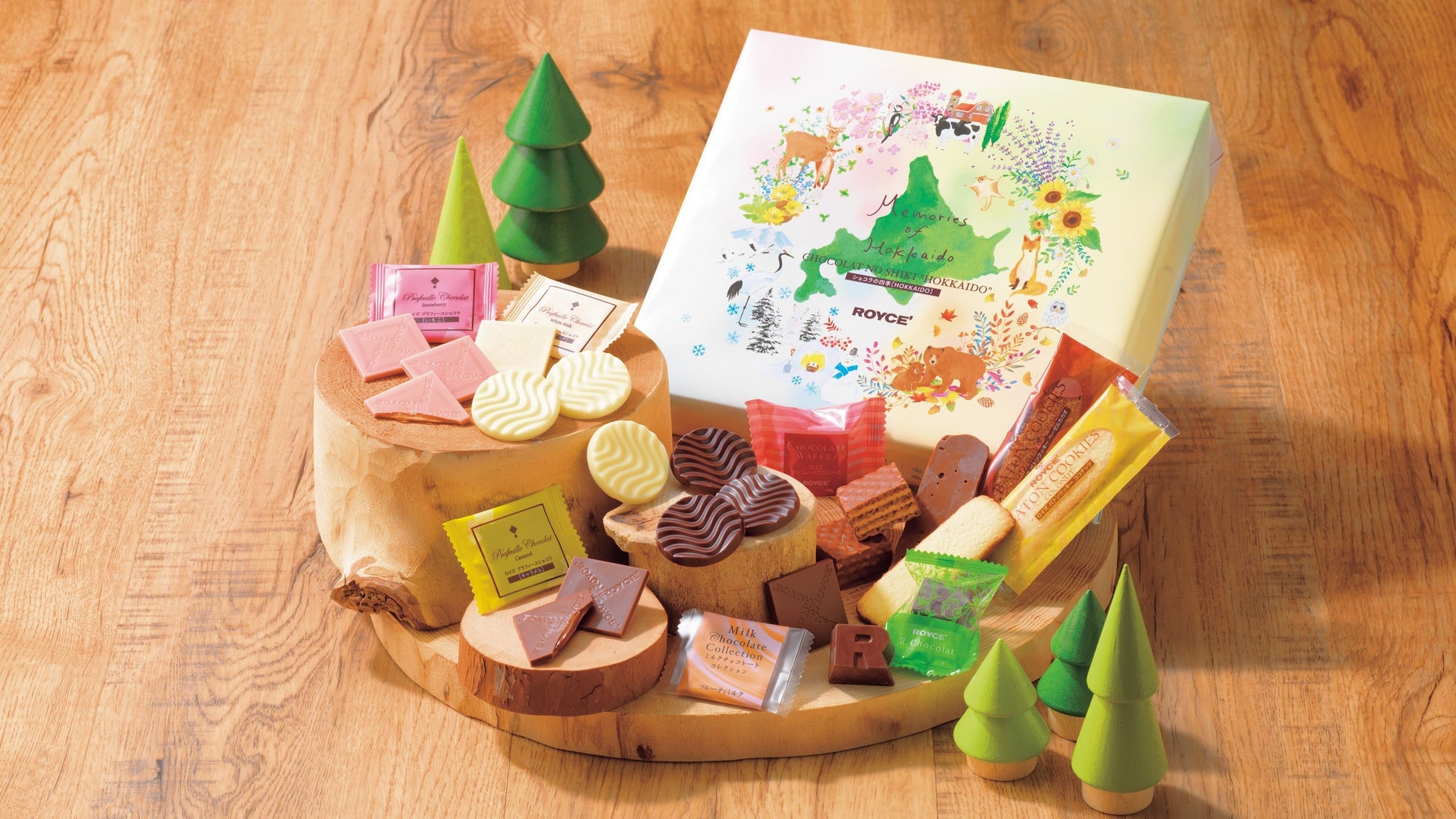 色や素材から、北海道の四季をイメージできるロイズのチョコレートをセレクトした詰め合わせです。パッケージには、北海道に住む動物や、北海道の四季折々の植物を描いており、北海道への旅気分を感じられるひと箱です。
