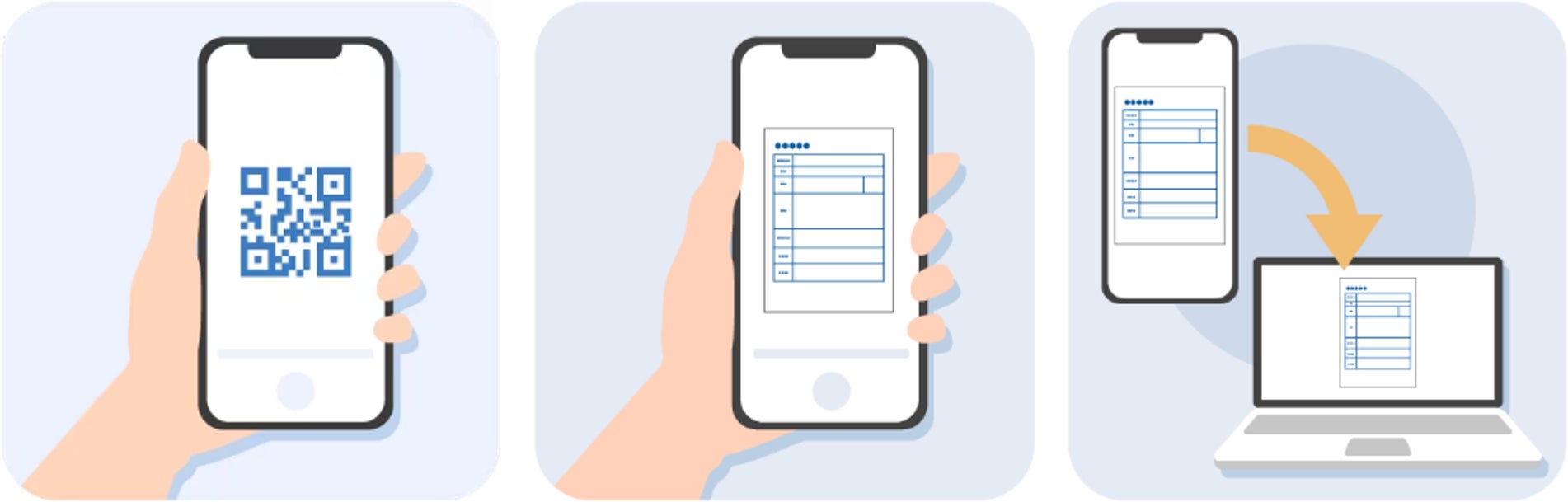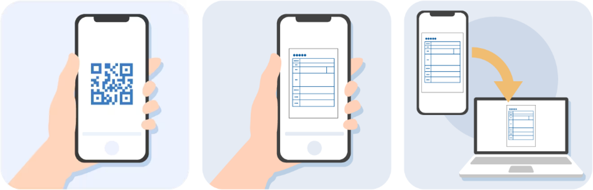 1. 画面上のQRコードをスマホで読み取り | 2. 記入したい書類を撮影 | 3. 「送る」をタップして送信 |