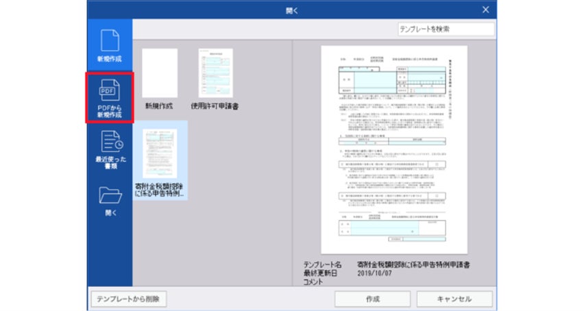 PDFファイルの背景取り込みが簡単になりました。新規作成の画面から直接PDFファイルを選択できるようになりました。