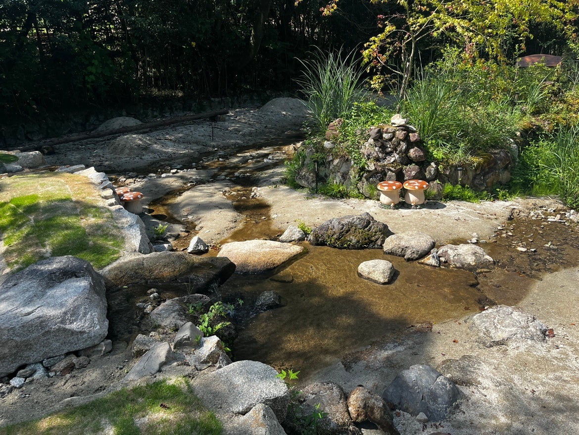 施設のシンボルである白川郷から移築された合掌造りの家は、どこか懐かしい雰囲気があり