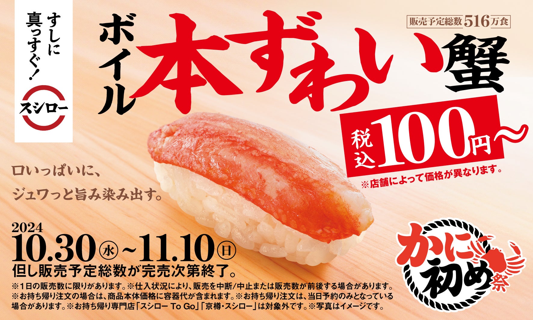 今シーズン初!スシロー『かに初め祭』を開催!おすしにラーメン、茶碗蒸しと“かに”づくし!目玉はボイル本ずわい蟹が税込100円~登場!