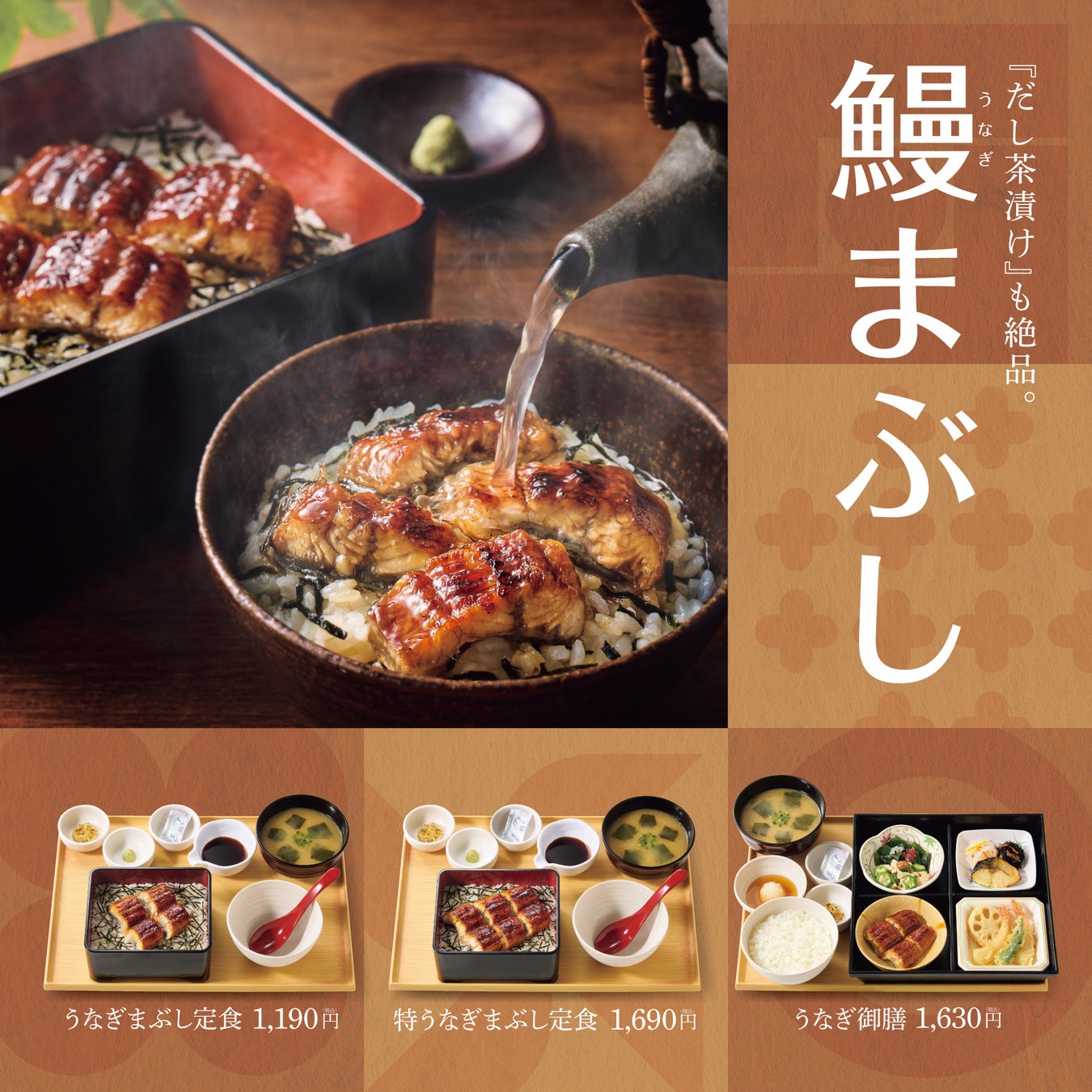 このたび「やよい軒」では、ふっくらと焼き上げたうなぎの蒲焼をうな重として味わえるほか、無料だしサービスでひつまぶし風だし茶漬けとしても楽しめる『うなぎまぶし定食』1,190円とうなぎ1.5倍の『特うなぎまぶし定食』1,690円、うなぎの蒲焼など4種の和惣菜が味わえる『うなぎ御膳』1,630円を6月25日(火)より発売いたします。