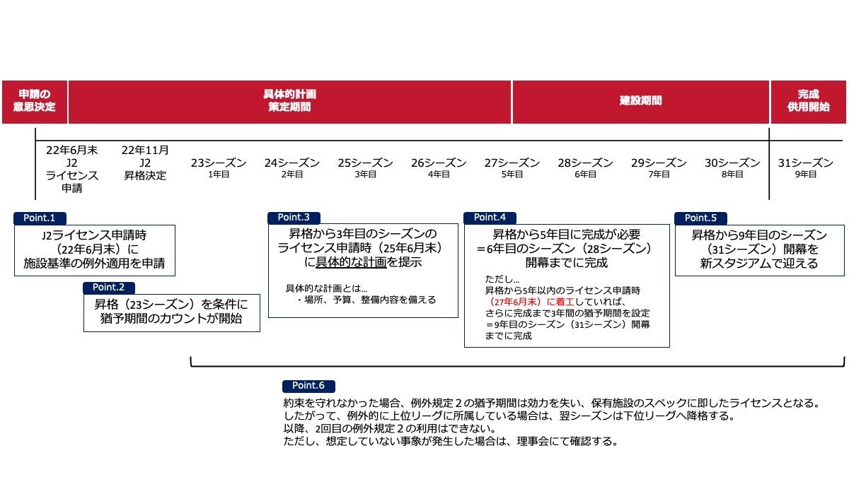 現在、いわきFCは、施設基準の例外適用申請によりJ1クラブライセンスを取得しており、2025年6月末のライセンス申請時に「具体的なスタジアム整備計画」を提出することが求められています。