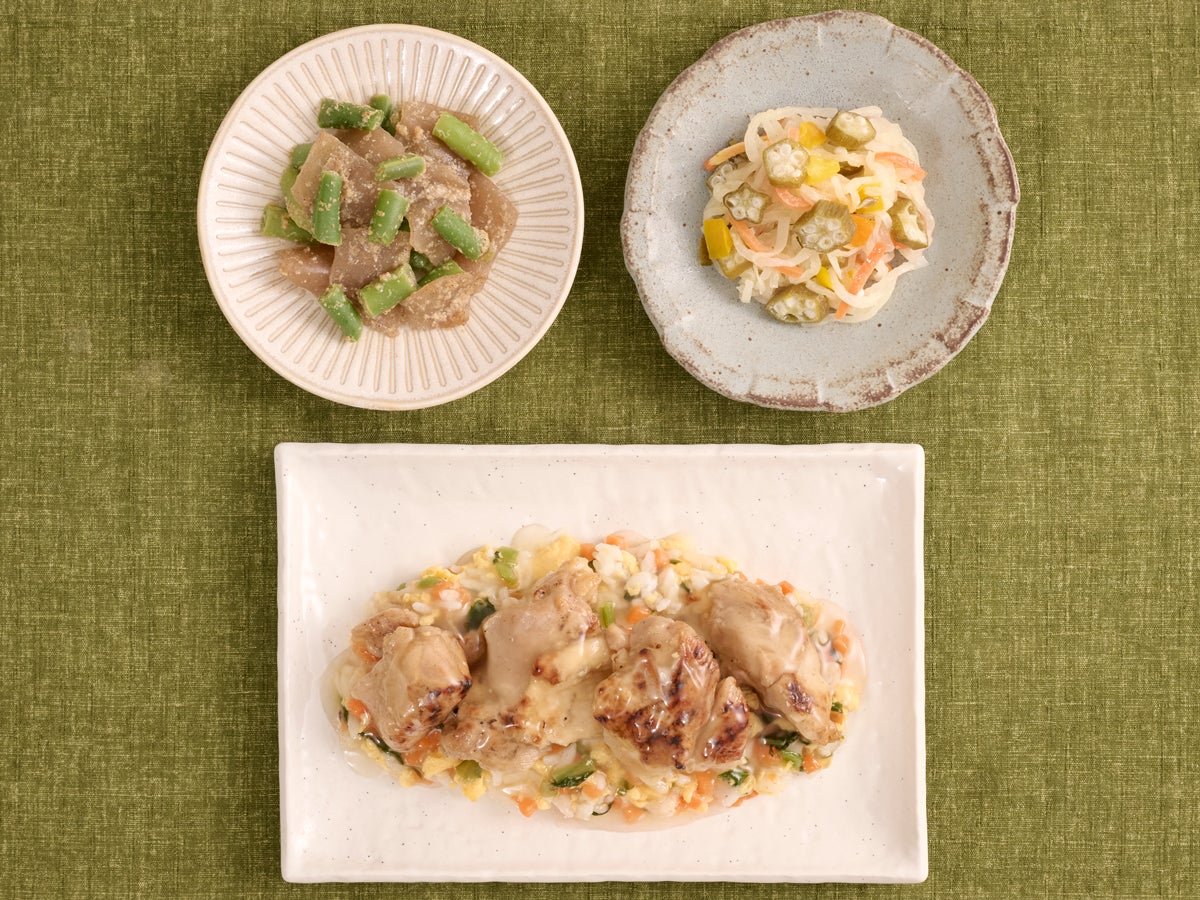副菜は、シャキシャキインゲンとぷるぷるこんにゃくの食感がベストマッチのインゲンとこんにゃくのごまだれ、まろやかな甘酸っぱさで食べやすく仕上げたオクラと大根のさっぱりサラダです。