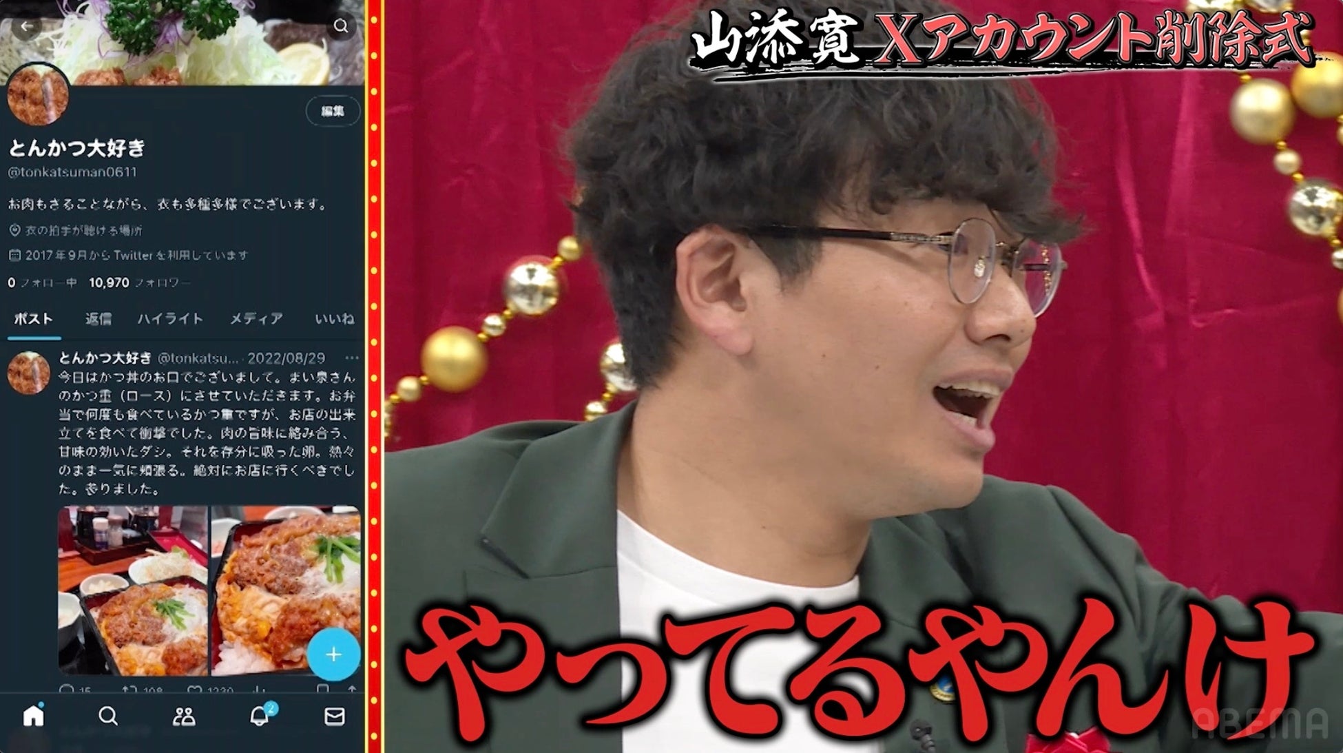 そして、最後にどんな言葉をつぶやくかで一悶着ありつつも、山添さんなりの言葉を最後に投稿し、ついにアカウントを削除した山添さん。Xとの決別に感慨深い表情を浮かべていた山添さんでしたが、突如「すみません。とんかつのことだけつぶやく裏アカウントどうしましょ?」と“裏アカ”の存在を明かし、亜生さんが「やってるやんけ!」「俺と一緒や」と声を荒げるなど、スタジオは騒然となりました。その後、とんかつの“裏アカ”も削除しようと操作を進める山添さんでしたが、まさかの問題が発生して…?本編は、放送後7日間、無料で見逃し視聴が可能です。ぜひ、ご覧ください。