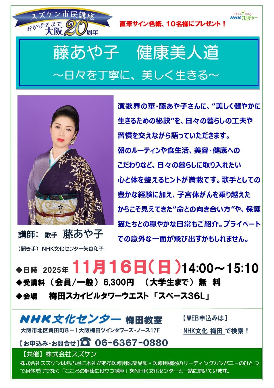 【NHKカルチャー】藤あや子が語る「健康美人道」 11月18日(日)大阪・梅田で開催。サイン色紙を抽選でプレゼント!