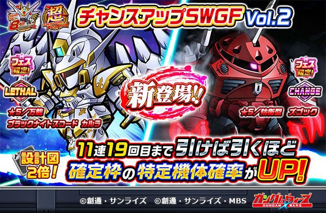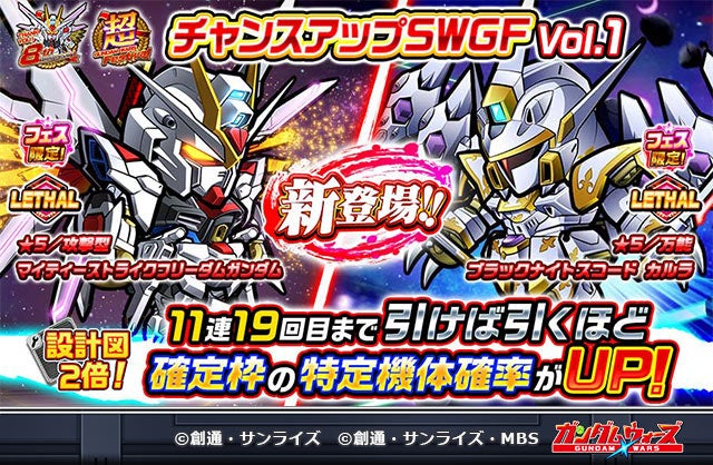今年大ヒットを記録した『機動戦士ガンダムSEED FREEDOM』から待望の新機体「マイティーストライクフリーダムガンダム(リーサル)」「ズゴック→インフィニットジャスティスガンダム弐式(換装)」「ブラックナイトスコード カルラ(リーサル)」が登場しました。さらに、期間中にガシャを引けば引くほど確定枠の特定機体確率がアップします。