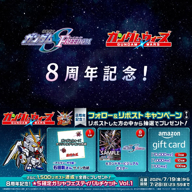 株式会社バンダイナムコエンターテインメントがLINEヤフー株式会社と展開するスマートフォン向けゲームアプリケーション「LINE: ガンダム ウォーズ」は、サービス開始から8周年を迎えました。これを記念して、さまざまなイベントやキャンペーンを開催します。さらに、『機動戦士ガンダムSEED FREEDOM』に登場するアスラン・ザラ役の石田彰さんがナレーションを担当する新PVも公開します。