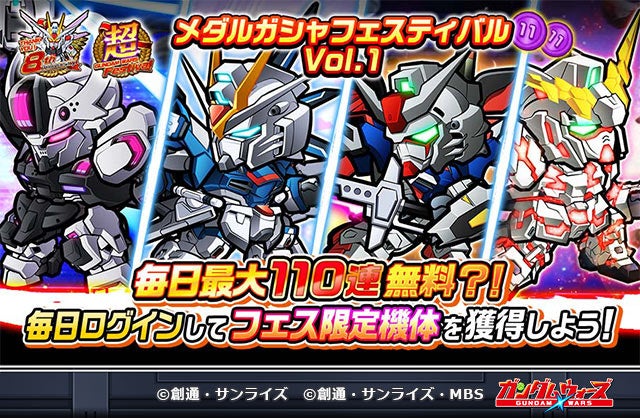 期間中、毎日無料ガシャを引くことができるキャンペーン「8周年記念!毎日最大110連無料?!メダルガシャフェスティバル」を開催します。一日の無料ガシャ回数は11~110連とランダムで変わります。さらに、11連10回目でフェス限定機体が確定で登場します。