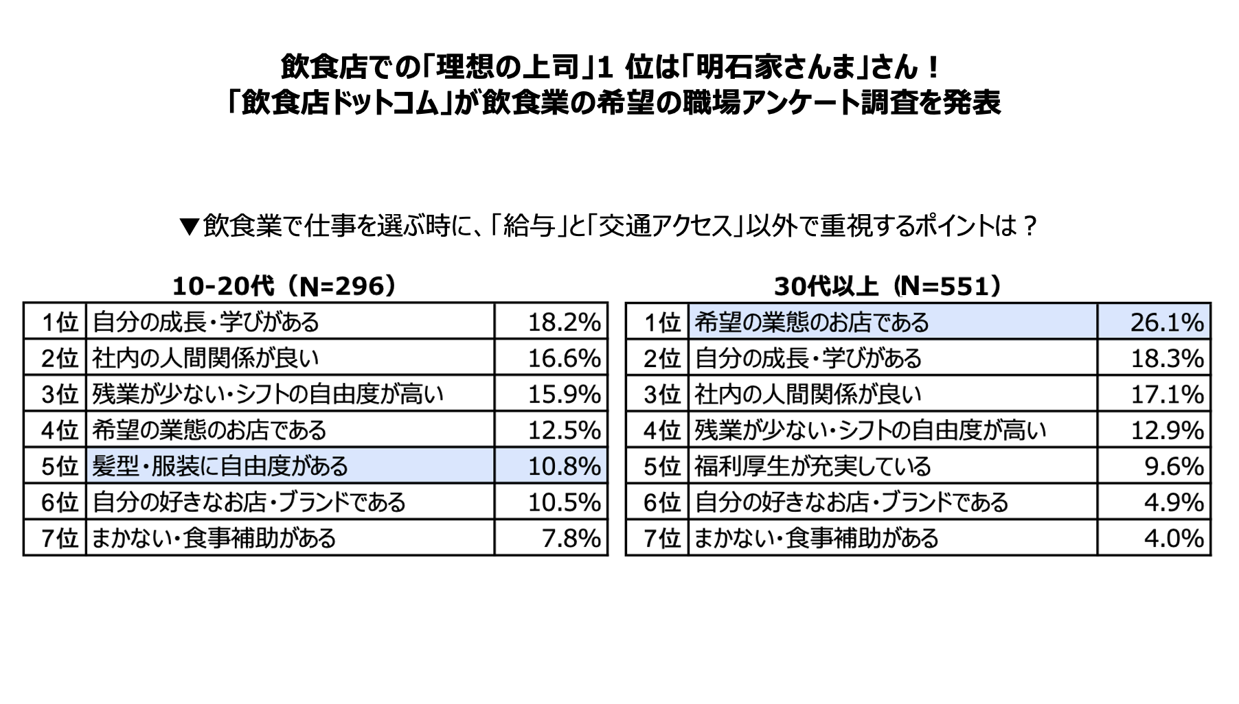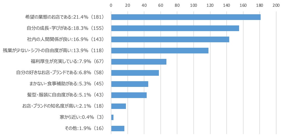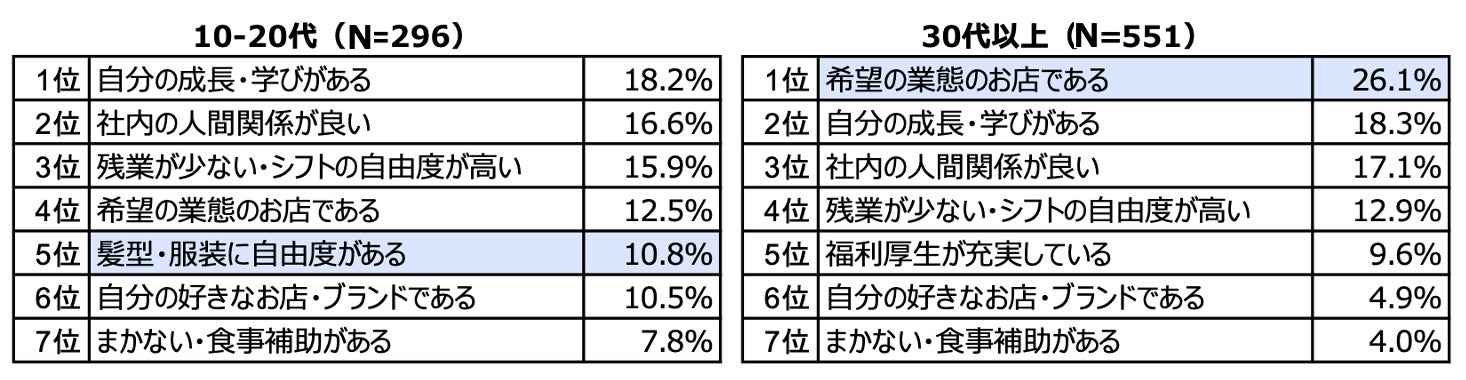 そして、Z世代は5位に「髪型・服装に自由度がある」(10.8%)がランクイン。仕事に自分らしさや楽しみながら仕事をしたいことが見て取れます。また、6位の「自分の好きなお店・ブランドである」(10.5%)が30代以上の回答(4.9%)よりも高く、飲食店選びは「業態」だけではなく、自分がその店舗を好きかどうかを重視していることも窺われます。