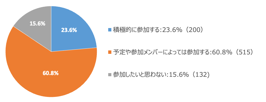 それぞれの理由を聞くと、「積極的に参加する」という人では、「コミュニケーションは大事だから」、「仕事以外で相手の人間性が知れるチャンス」、「情報収集ができるから」という声が、「予定や参加メンバーによっては、参加する」と回答した人では、「仲が良い人がいれば参加したいが、そうでない場合は楽しく過ごせないと思うから」、「プライベートを優先して、都合が合えば参加する」などの意見がありました。