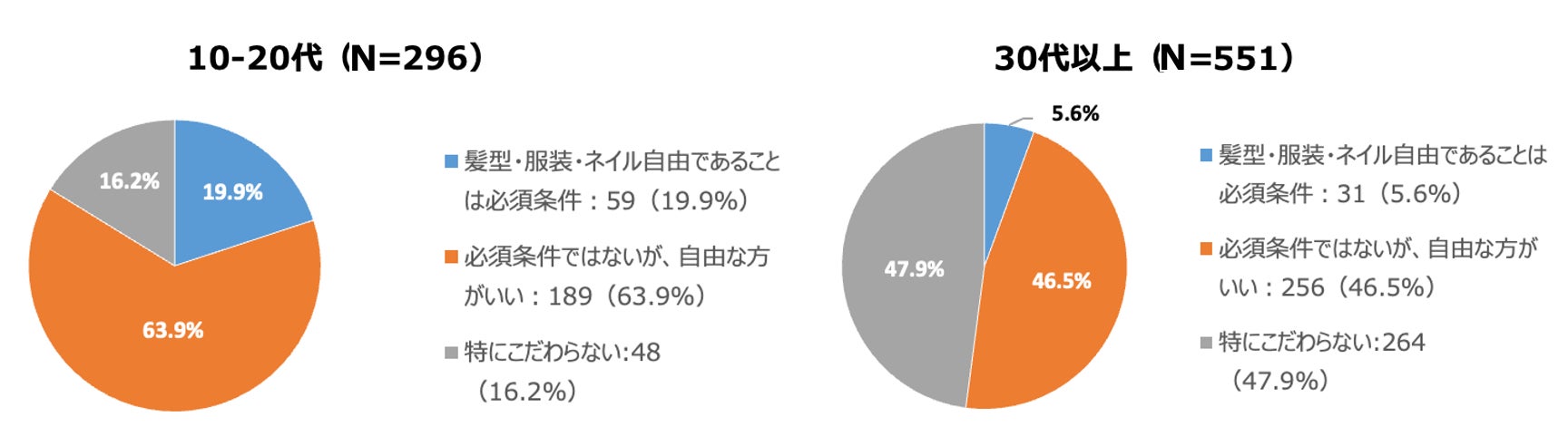 前の質問でZ世代が「髪型・服装に自由度がある」条件を重視していたことを受けて、職場選びの際にどれくらい重視するかを聞いたところ、Z世代は「自由であることは必須条件」(19.9%)、「必須条件ではないが、自由な方がいい」(63.9%)という結果に。30代以上の「自由であることは必須条件」(5.6%)、「必須条件ではないが、自由な方がいい」(46.5%)と比較すると大きな差が見られました。