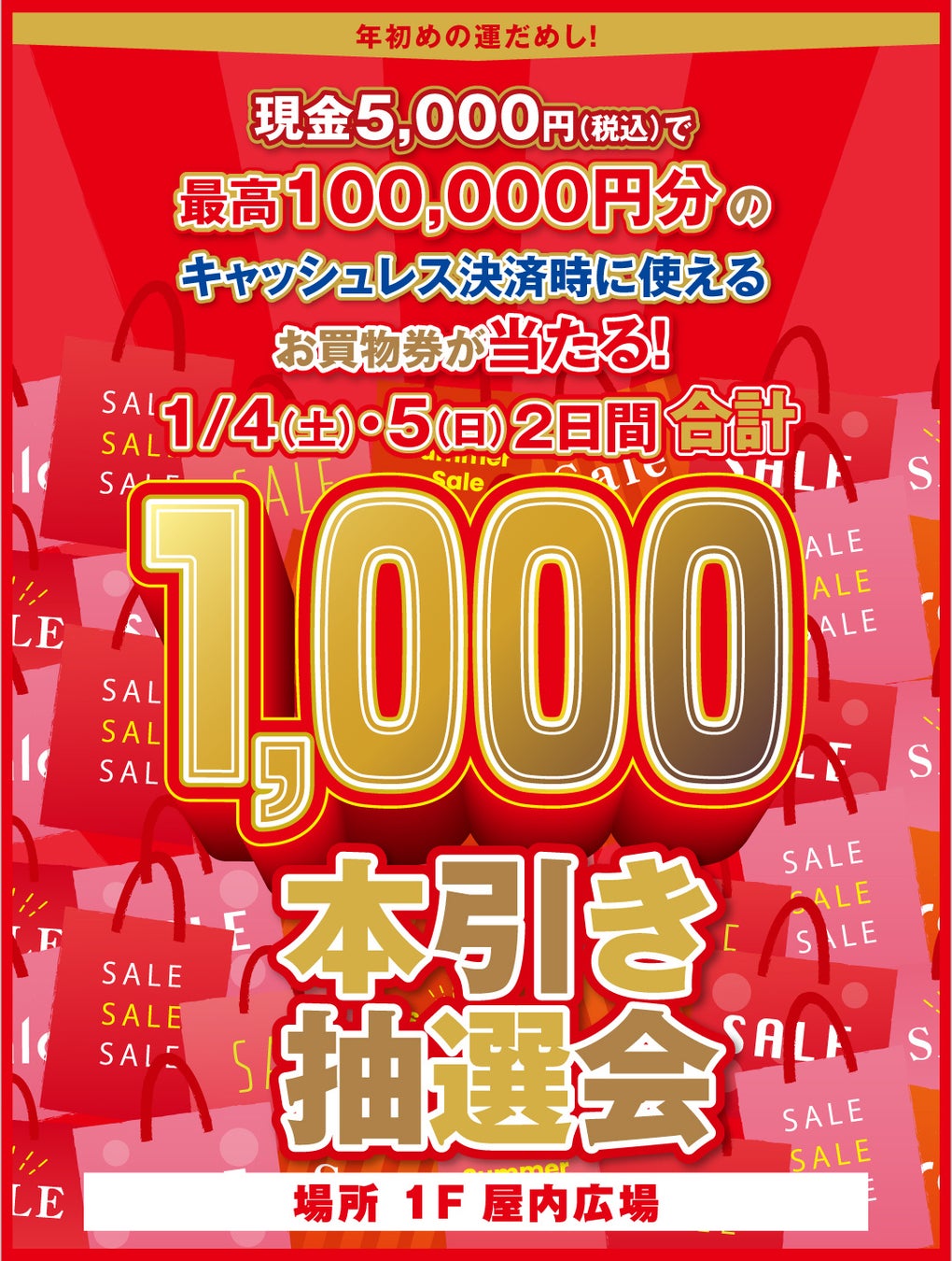 現金5,000円(税込)で5,500円以上のお買物券が当たるハズレなしの1,000本引きを開催!