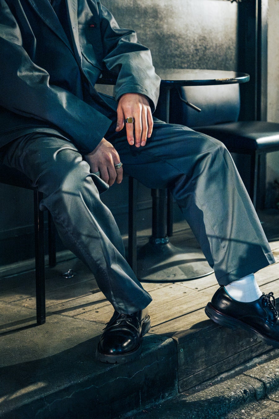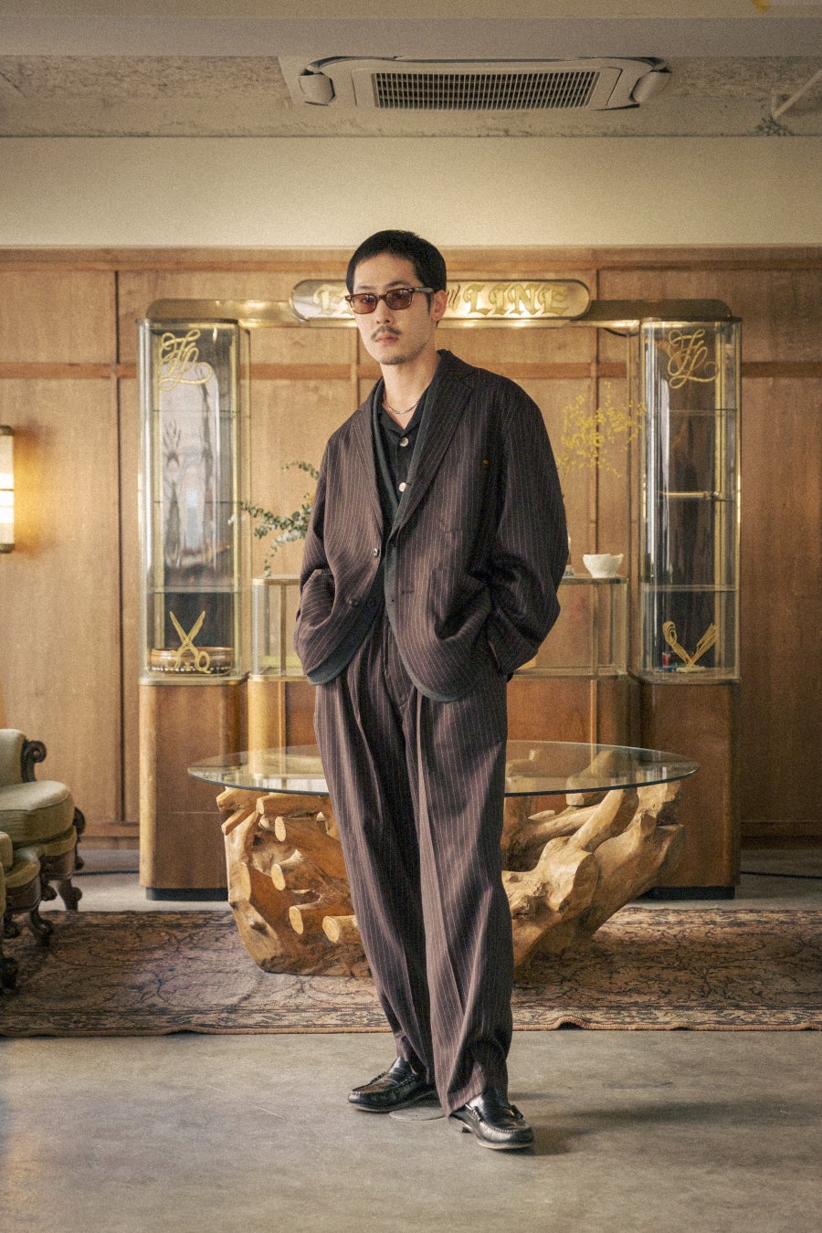 展開するアイテムは、ブランド定番のツイル生地をやや柔らかな風合いで仕上げた素材を使用したテーラードジャケット・パンツから、バギーシルエットのパンツまで様々。レーヨンを混合し、とろみのあるTR生地を採用したセットアップなど、幅広くラインナップした。